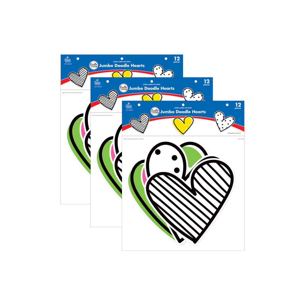 Decorate any area of your classroom with Kind Vibes Jumbo Doodle Hearts Cut-Outs®. Featuring extra large doodle hearts in cheerful shades of color or black-and-white stripes or polka dots, these cut-outs are sure to add a touch of fun to any space. Each pack includes these assorted designs ranging in size from the largest, 11.41" x 11.4", to the smallest, 11.42" x 10.34". Each pack includes 12 cut-outs (3 each: polka-dotted, striped, 1 each: blue, green, orange, pink, purple, yellow). Sold as 3 packs for a total of 36 cut-outs.
