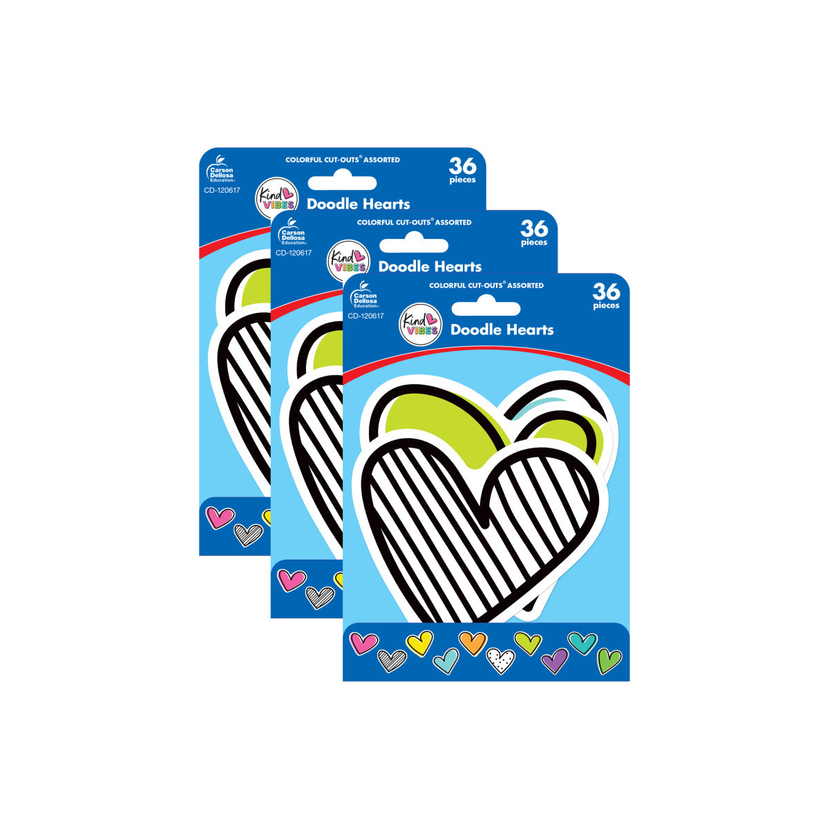 Decorate any area of your classroom with Kind Vibes Doodle Hearts Colorful Cut-Outs®. Featuring cheerful shades of color or black and white, these cut-outs are sure to add a touch of fun to any space. This pack includes these assorted designs, ranging in size from the largest, 5.83" x 5.48" to the smallest, 5.46" x 4.55". Each pack includes 36 cut-outs (3 each: blue, green, lime, orange, pink, purple, teal, yellow, 6 each: polka-dotted, striped). Sold as 3 packs for a total of 108 cut-outs.