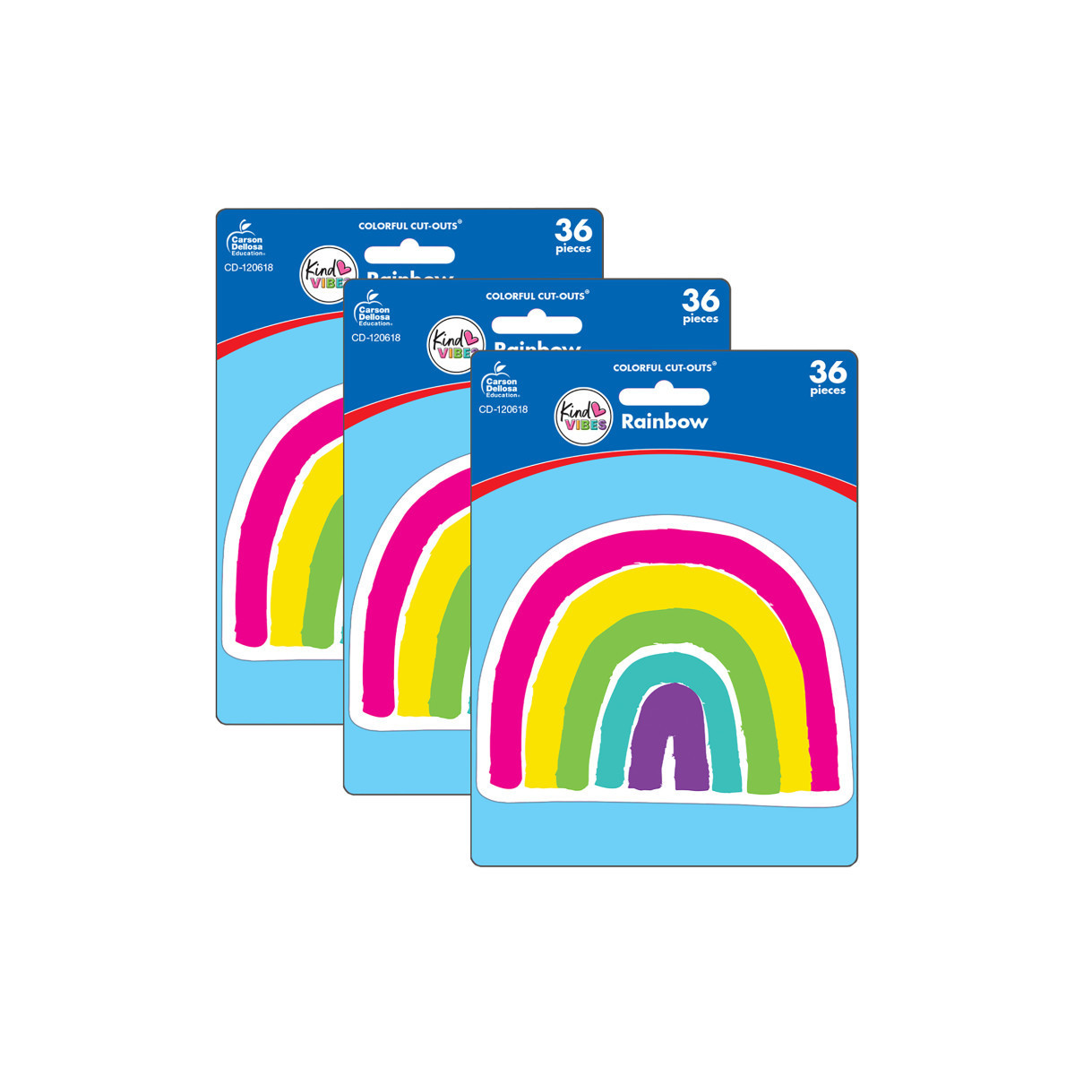 Decorate any area of your classroom with the Kind Vibes Rainbow Colorful Cut-Outs®. Featuring rainbows in brilliant, happy colors, each of these 5.61" x 4.36" cut-outs are sure to add a touch of fun to any space. Each pack includes 36 cut-outs. Sold as 3 packs for a total of 108 cut-outs.