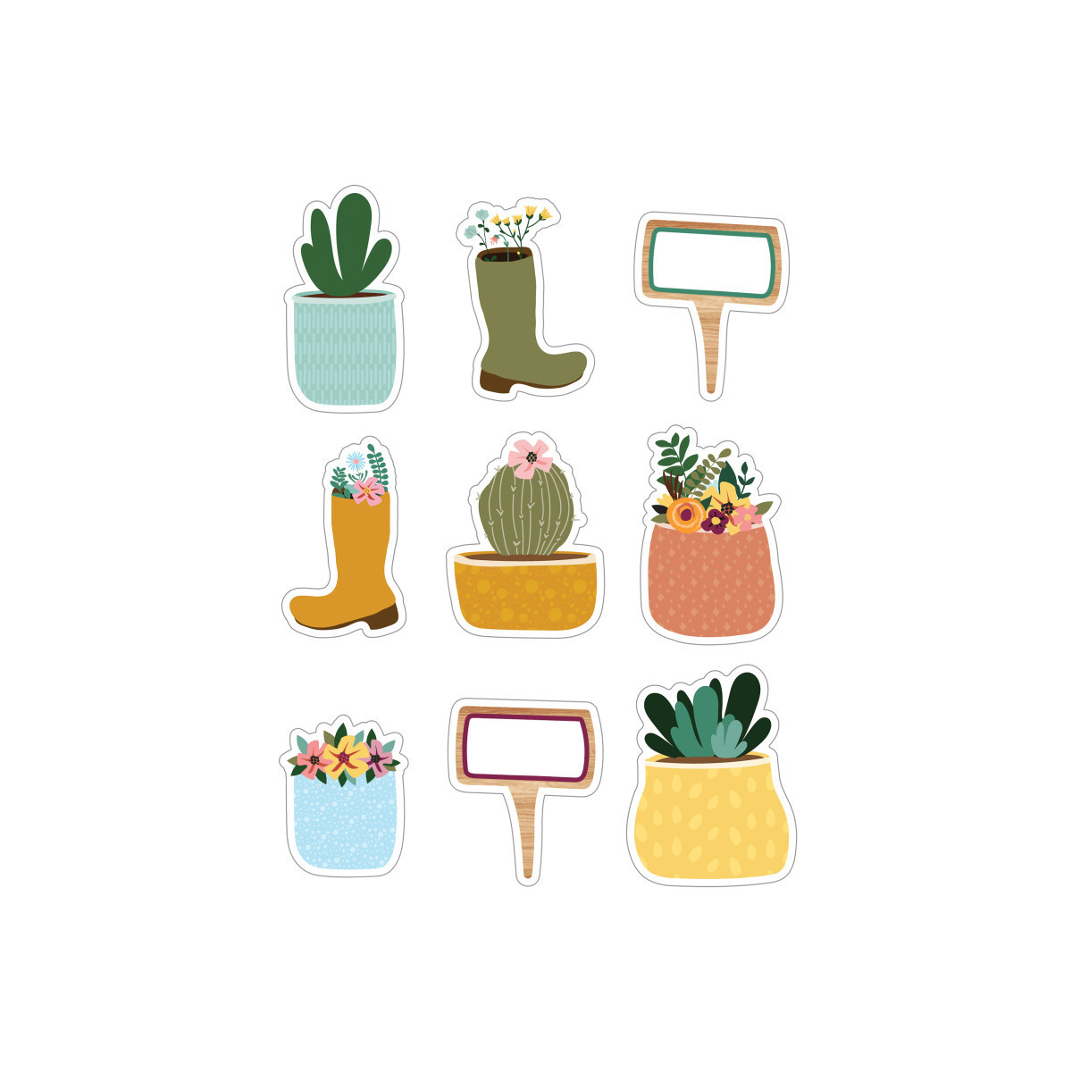 Add the perfect finishing touches to any room or display with Carson Dellosa's Grow Together Garden Bulletin Board Cutouts! Cutouts are ideal for just about anything. The 36-piece set features 9 flowerpots ranging in size from 4" x 5" to 4.35" x 6", 9 plants ranging in size from 3.2" x 6" to 5" x 6.35", 12 yellow and green boots ranging in size from 3.8" x 6 to 4" x 5, and 6 green and purple 4.8" x 5.7" garden signs—perfect for spring décor and summer bulletin board decorations. Printed on durable card stock, these versatile, ready-to-use bulletin board decorations are die-cut and reusable if laminated. With plenty of writing room, cut-outs can be used as desk or cubby tags, as invitations, postcards, flash cards, craft projects, games, and more. Check out other Grow Together products to create a cohesive classroom theme!