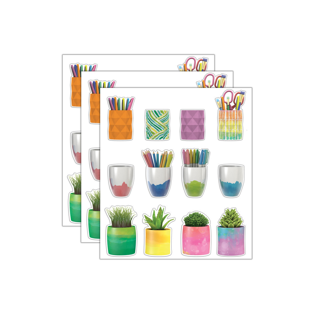 Add a touch of greenery to your classroom décor using the Carson Dellosa Creatively Inspired Succulent Plant & Cup Bulletin Board Cut-outs—perfect for white board, cork board, bulletin board, and other room décor. Each 36-piece bulletin border decorations pack includes 12 yellow, green, pink, and purple planters (3 of each) ranging in size from 3.8" x 5.7"—4.1" w x 6.41", 12 orange, purple, striped, and boho rainbow geometric cups (3 each) ranging in size from 3.2" x 4"—3.85" x 6.41", and (12) 3.3" x 4.23" green, pink, light and dark blue mugs (3 each). Use the classroom cutouts to label teacher supplies, classroom supplies, lockers and cubbies, or use the plant décor for party decorations, summer bulletin board decorations, and more. Made from one-sided, durable cardstock paper each piece of colorful décor can be laminated for year-round use. Sold as 3 packs for a total of 108 cut-outs.
