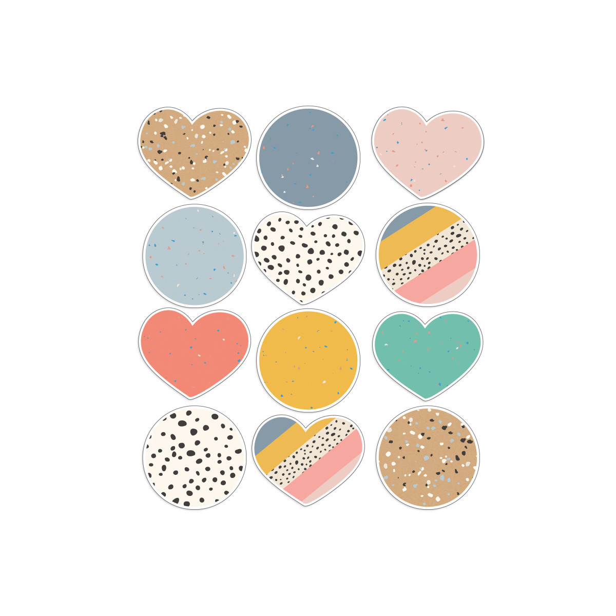 The 12-piece bulletin border decorations set includes 6 assorted 12" x 12" hearts, and 6 assorted 12" x 12" dots in a variety of colors and designs. Use the classroom cutouts to label teacher supplies, classroom supplies, daycare supplies, lockers and cubbies, or create flash cards, Valentines classroom décor, and more. Printed on one-sided durable cardstock paper, each of the dot and heart décor is reusable and can be laminated for boho classroom décor you can use year-round.