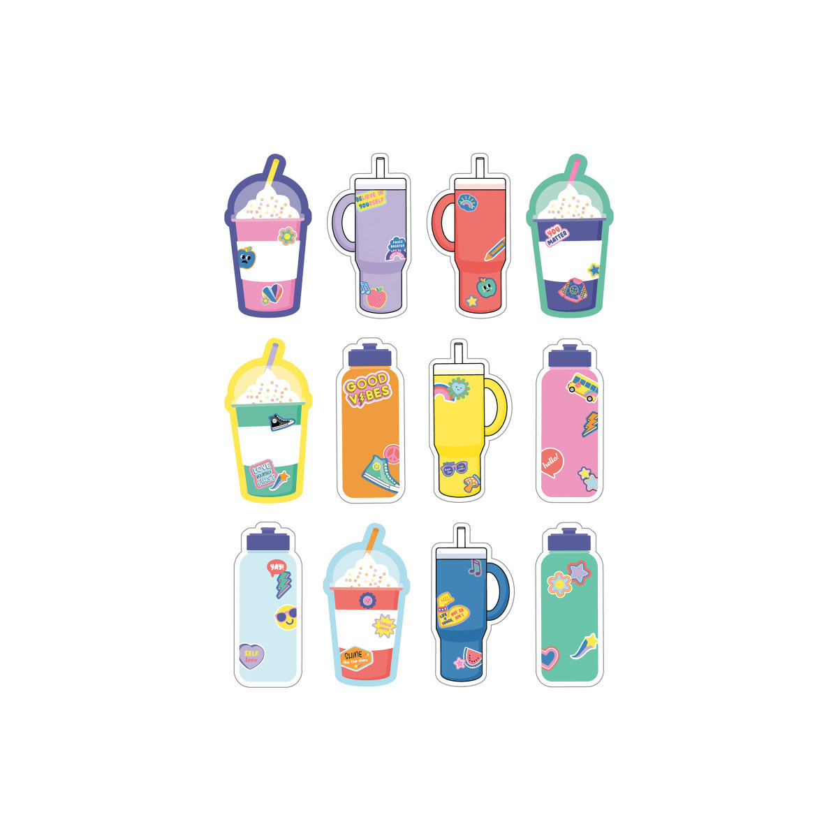 Add some funky vibes to classroom labels and classroom décor with Carson Dellosa's We Stick Together Hydroflask and Water Bottle Cutouts! Each bulletin board cutouts pack features 12 hydroflask cutouts (6.2" x 3.2" each), 12 colorful cup cutouts (6.2" x 3.3" each), and 12 colorful water bottle cutouts (6.2" x 2.6" each) for bulletin board displays, arts and crafts, name tags, and more classroom fun!