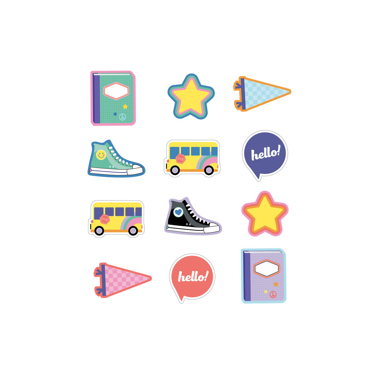 Add some style to back to school classroom labels and classroom décor with Carson Dellosa's We Stick Together Hello School Cutouts! Each bulletin board cutouts pack features 6 notebooks, 6 school bus, 6 pennants, 6 sneakers, 6 speech bubbles, and 6 star classroom cutouts for bulletin board displays, arts and crafts, student name tags, and so much more.