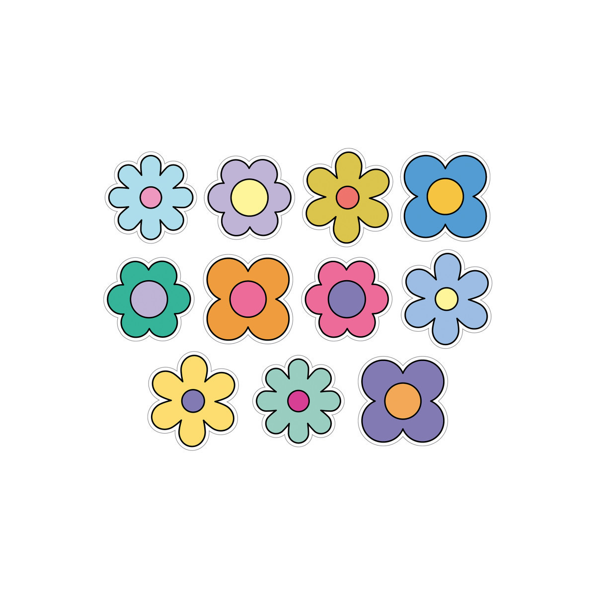 Watch your space blossom to life when you plant some Retro Remix Flower Bulletin Board Decorations into your home décor, party décor, or classroom décor! The set includes 3 blue, chartreuse, coral, lavender, light blue, mint, orange, pink, powder blue, purple, teal, and yellow flowers for a total of 36 flowers for decoration. Each of the paper flowers is printed on durable cardstock paper and ranges in size from 5.11" x 4.72" to 5.16"—the perfect size paper flower decorations for wall, bulletin board, white board, and cork board displays.