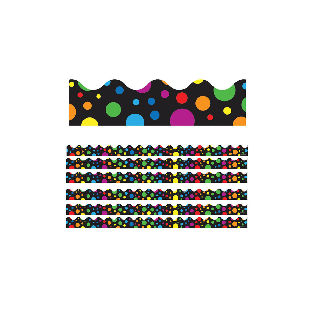 Perfect to use alone or in layers, these straight borders come in packs of twelve 3' x 3" strips for a total length of 36 feet per pack! The strips are great for framing your bulletin boards and windows or for complementing charts and class creations, and their straight edges ensure design continuity. Borders are available in a variety of colors, styles, sizes, and prints to suit any classroom theme! Each pack includes 12 strips. Sold as 6 packs for a total of 72 strips (216 feet) of border.