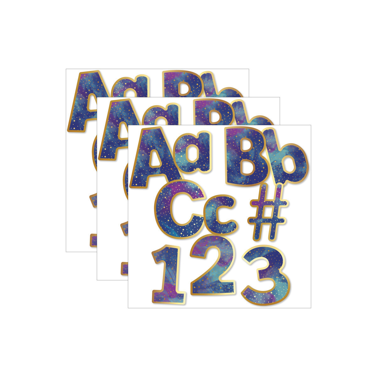 Create attention-grabbing displays with the Galaxy 4" EZ Letters Combo Pack. All characters feature a shining gold border and vibrant colors to help your message stand out! Take your displays from dull to dazzling with Carson-Dellosa's EZ Letters. These letters add an energetic touch to any classroom, and you can use them for any grade. Make sure to view other Galaxy products to create a cohesive classroom theme. This 219-piece pre-punched set includes these characters: 70 uppercase letters, 87 lowercase letters, 20 numbers, 20 punctuation marks, and 22 symbols. Sold as 3 packs for a total of 657 pieces.