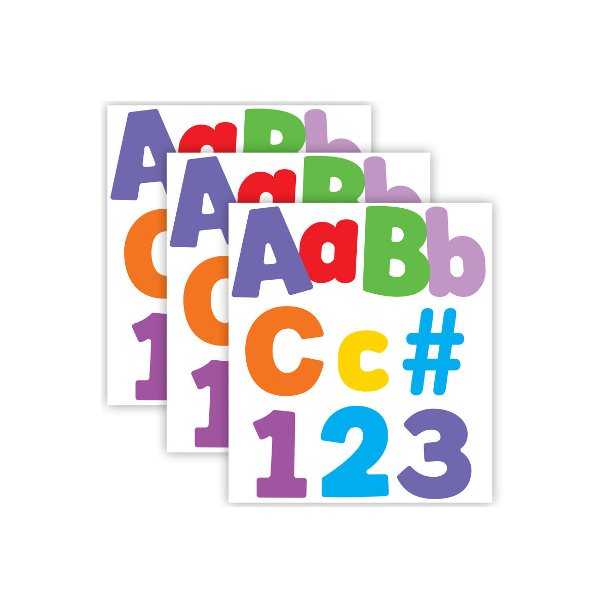 Add a splash of color to messages on bulletin board, cork board, and other wall décor and classroom decorations using the Carson Dellosa Color Splash Bulletin Board Letters Pack! Each 219-piece classroom wall décor pack includes 70 uppercase letters and 87 lowercase letters for bulletin board displays, 20 numbers, and 20 punctuation marks, and 22 symbols in a variety of colors to accentuate your rainbow décor or any other colorful décor. Each of the letters, numbers, punctuation, and symbol bulletin board decorations measures 4" tall—the perfect size for alphabet wall decals, party or bulletin board décor, and boho rainbow classroom décor. Use the cut out letters to create a letter board, display board, alphabet line for classroom wall, and number line for classroom wall, or decorate cork board, bulletin board, and chalk board displays with ease. Sold as 3 packs for a total of 657 pieces.