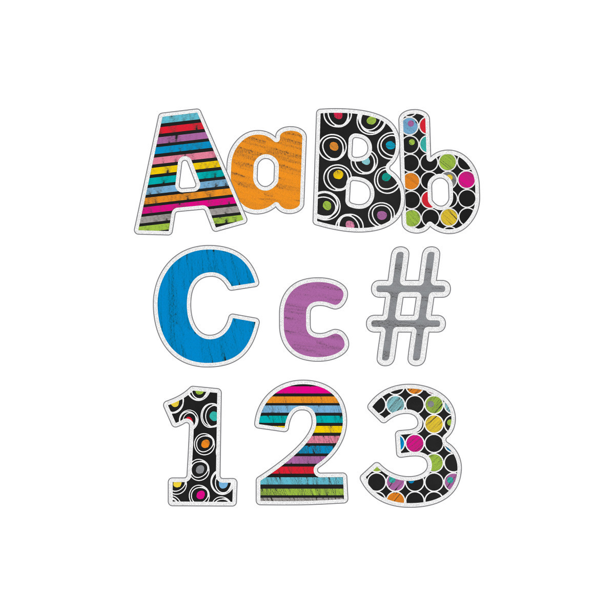 Add modern farmhouse charm to messages on bulletin board, cork board, and other wall décor and classroom decorations using the Carson Dellosa Colorful Chalkboard Bulletin Board Letters Pack! The 219-piece classroom wall décor set includes 70 uppercase letters and 87 lowercase letters for bulletin board displays, 20 numbers, and 20 punctuation marks, and 22 symbols in a colorful and chic chalkboard design. Each of the letters, numbers, punctuation, and symbol bulletin board decorations measures 4" tall—the perfect size for alphabet wall decals, party or bulletin board décor, and farmhouse classroom décor. Use the cut out letters to create a letter board, display board, alphabet line for classroom wall, and number line for classroom wall, or decorate cork board, bulletin board, and chalk board displays with ease.