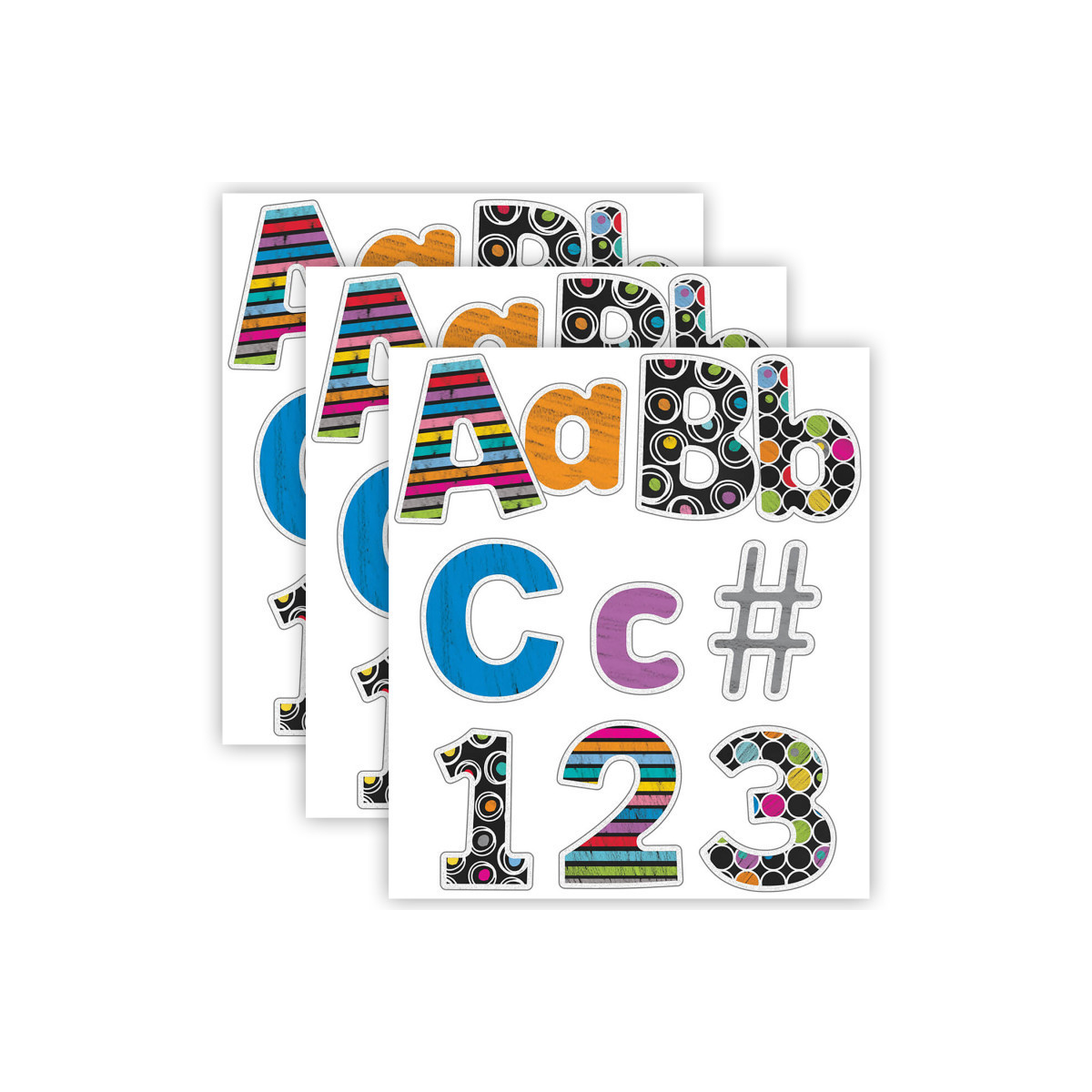 Add modern farmhouse charm to messages on bulletin board, cork board, and other wall décor and classroom decorations using the Carson Dellosa Colorful Chalkboard Bulletin Board Letters Pack! Each 219-piece classroom wall décor pack includes 70 uppercase letters and 87 lowercase letters for bulletin board displays, 20 numbers, and 20 punctuation marks, and 22 symbols in a colorful and chic chalkboard design. Each of the letters, numbers, punctuation, and symbol bulletin board decorations measures 4" tall—the perfect size for alphabet wall decals, party or bulletin board décor, and farmhouse classroom décor. Use the cut out letters to create a letter board, display board, alphabet line for classroom wall, and number line for classroom wall, or decorate cork board, bulletin board, and chalk board displays with ease. Sold as 3 packs for a total of 657 pieces.