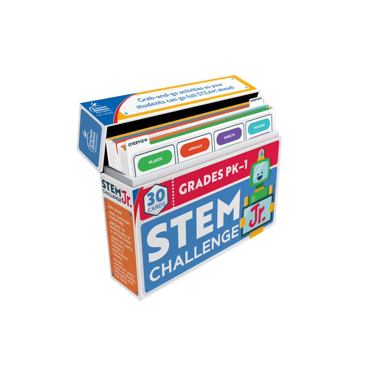 Help students go full STEAM ahead with grab-and-go activities! STEM Challenges, Jr. for grades PK–1 provides a fun way to enhance STEM learning in the classroom. This boxed set includes 30 full-color challenge cards that are designed to capture a student's attention with diverse, simple, and easy to complete activities. These engaging cards cover essential science topics for young learners such as plants, animals, insects, weather, transportation, and more. Students will complete challenges where they make a seed carrier, design a squirrel-proof bird feeder, build an igloo, and more!