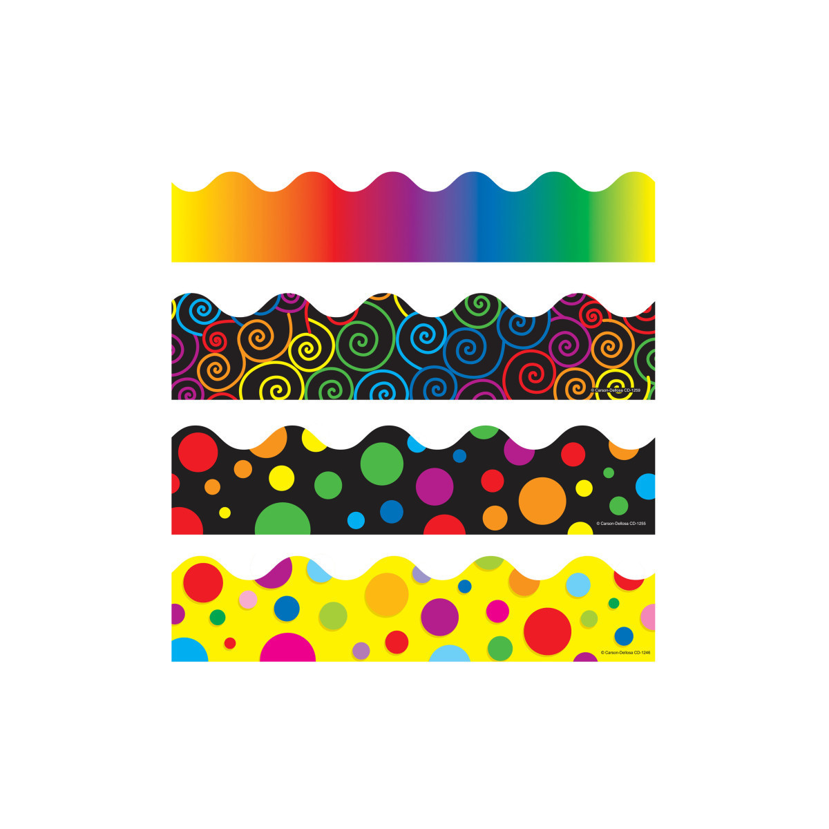 Give your bulletin board displays the perfect finishing touch with eye-catching border trim! These scalloped borders feature bright rainbow colors and fun designs. This set includes 13 strips each of these four scalloped borders:• Rainbow