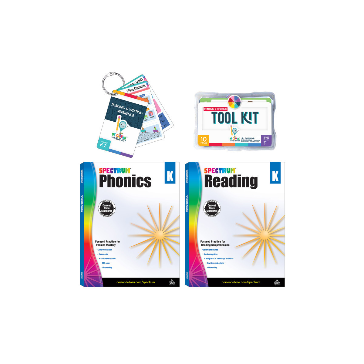 The 29-piece kit includes Spectrum Reading and Phonics kindergarten workbooks, Be Clever Wherever Reading & Writing Tool Kit (10 pieces), and Be Clever Wherever Things on Rings Reading & Writing Reference (16 cards; 1 book ring).