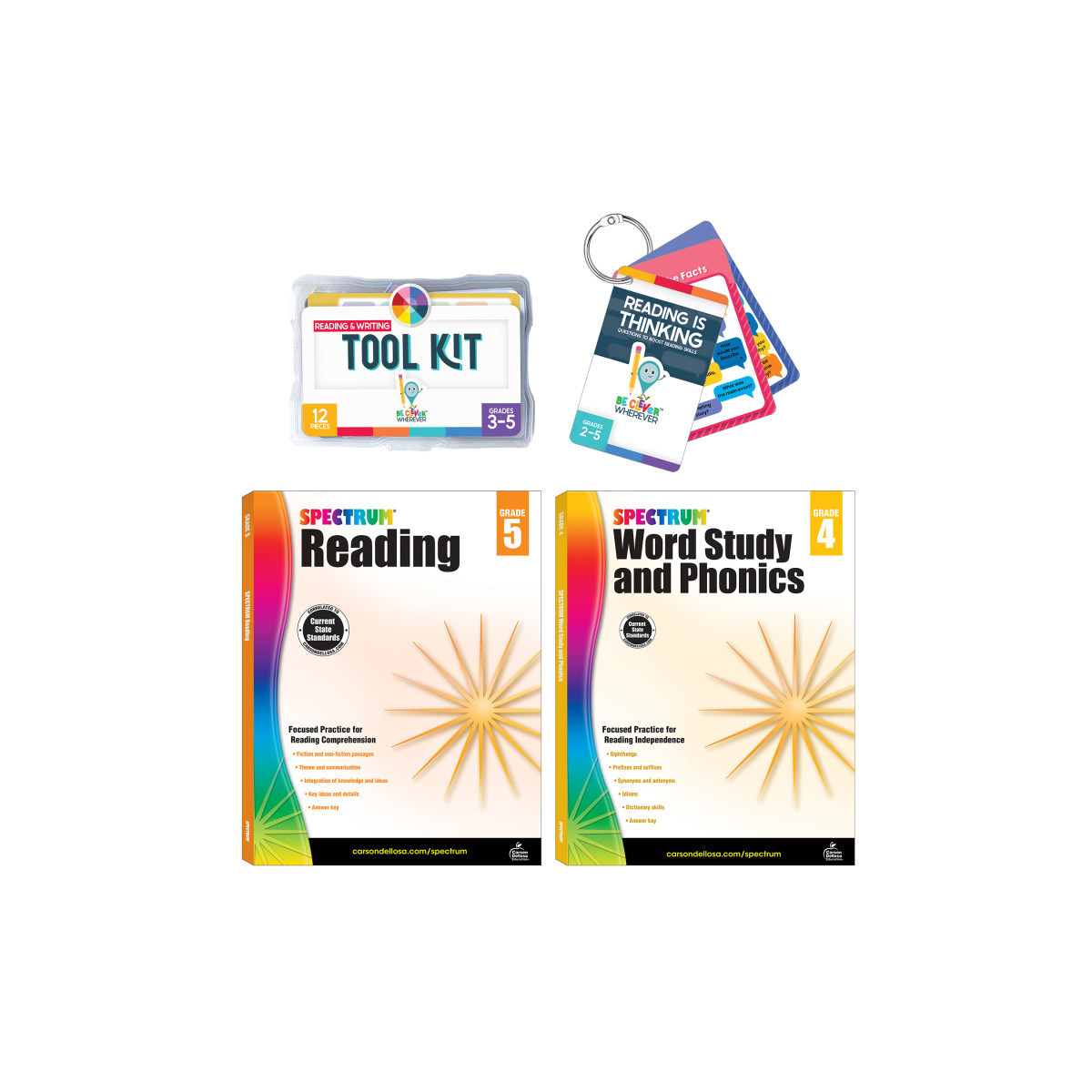Bring language arts learning to life for 4th grade students with Carson Dellosa's 4th Grade Reading Bundle, packed full of engaging manipulatives and reading and phonics activities. The 31-piece kit includes Spectrum Grade 4 Reading and Word Study & Phonics workbooks, Be Clever Wherever 12-piece Reading & Writing Tool Kit, and Be Clever Wherever Things on Rings Reading Is Thinking (16 cards; 1 book ring). The Spectrum grade 4 phonics workbook and grade 4 reading comprehension workbook teach 4th graders essential skills like diphthongs, dictionary skills, theme, and more through engaging activities and reading passages.