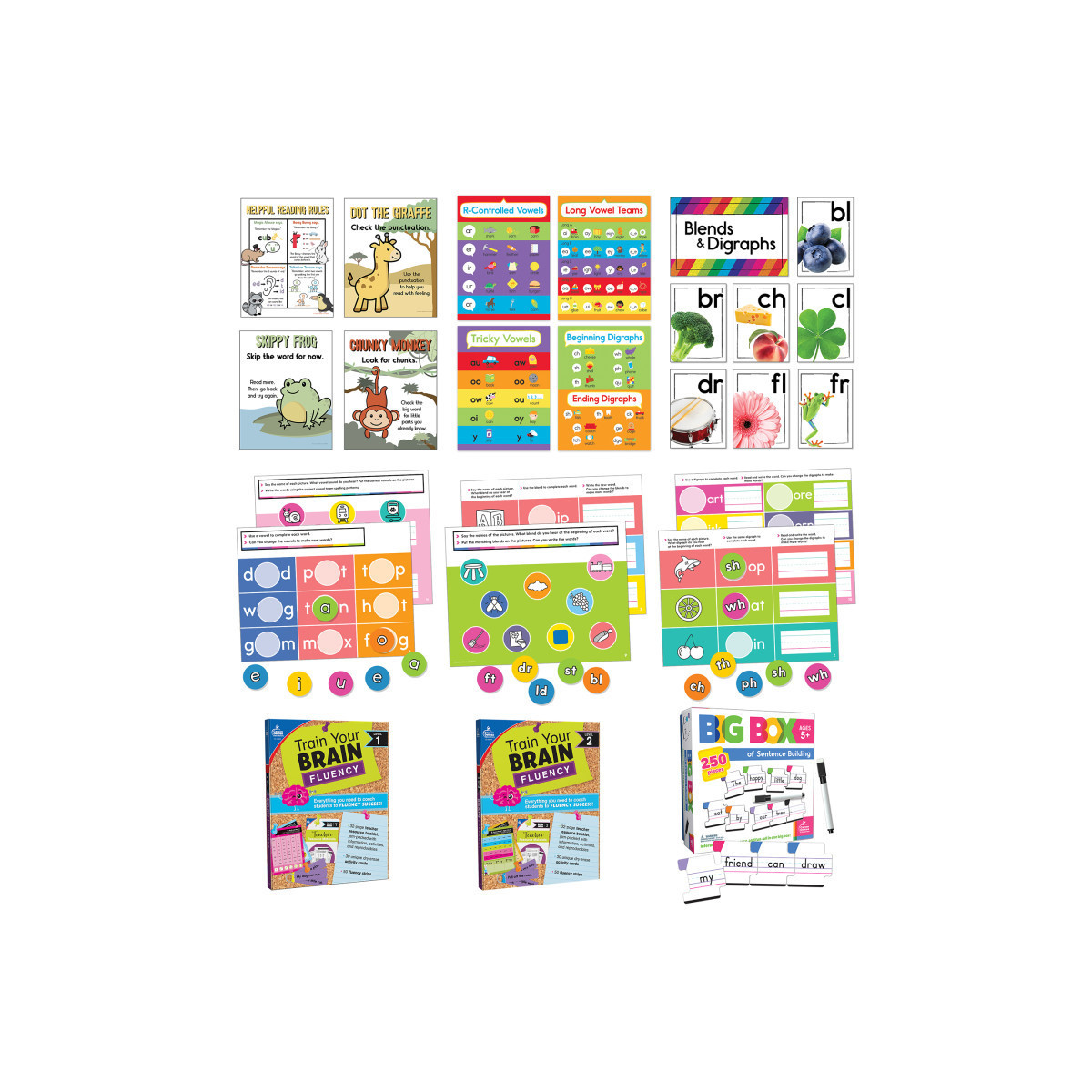 What's Included: The 531-piece kit includes phonics posters and charts, Blends & Digraphs bulletin board set, vowels, digraphs, and blends dry-erase manipulatives, Big Box of Sentence Building puzzle, and Train Your Brain: Fluency Level 1 and 2.