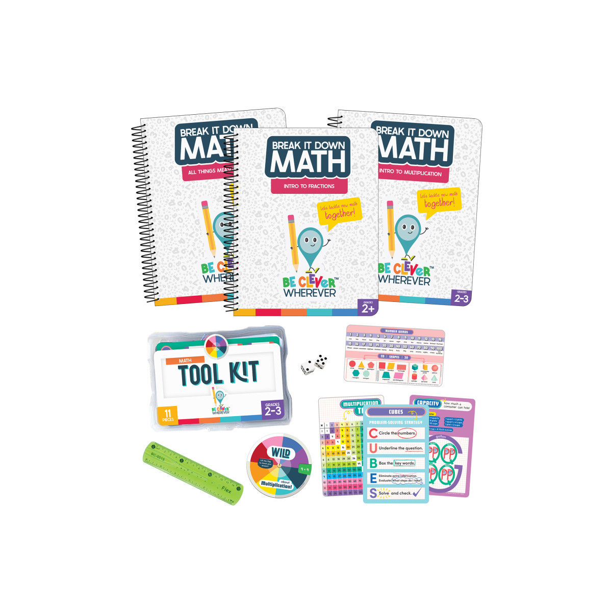 What's Included: The 14-piece math kit includes Intro to Multiplication, Intro to Fractions, and All Things Measurement resource books, as well as a 2-3 Math Tool Kit.
