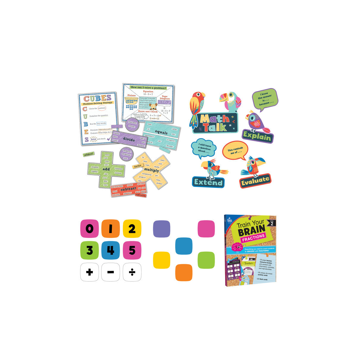 What's Included: The 285-piece math kit includes problem solving & math talk bulletin board sets, fraction classroom cutouts, blank and numbers & operations dry-erase math manipulatives, and Train Your Brain: Fractions Level 2 instructional resource.