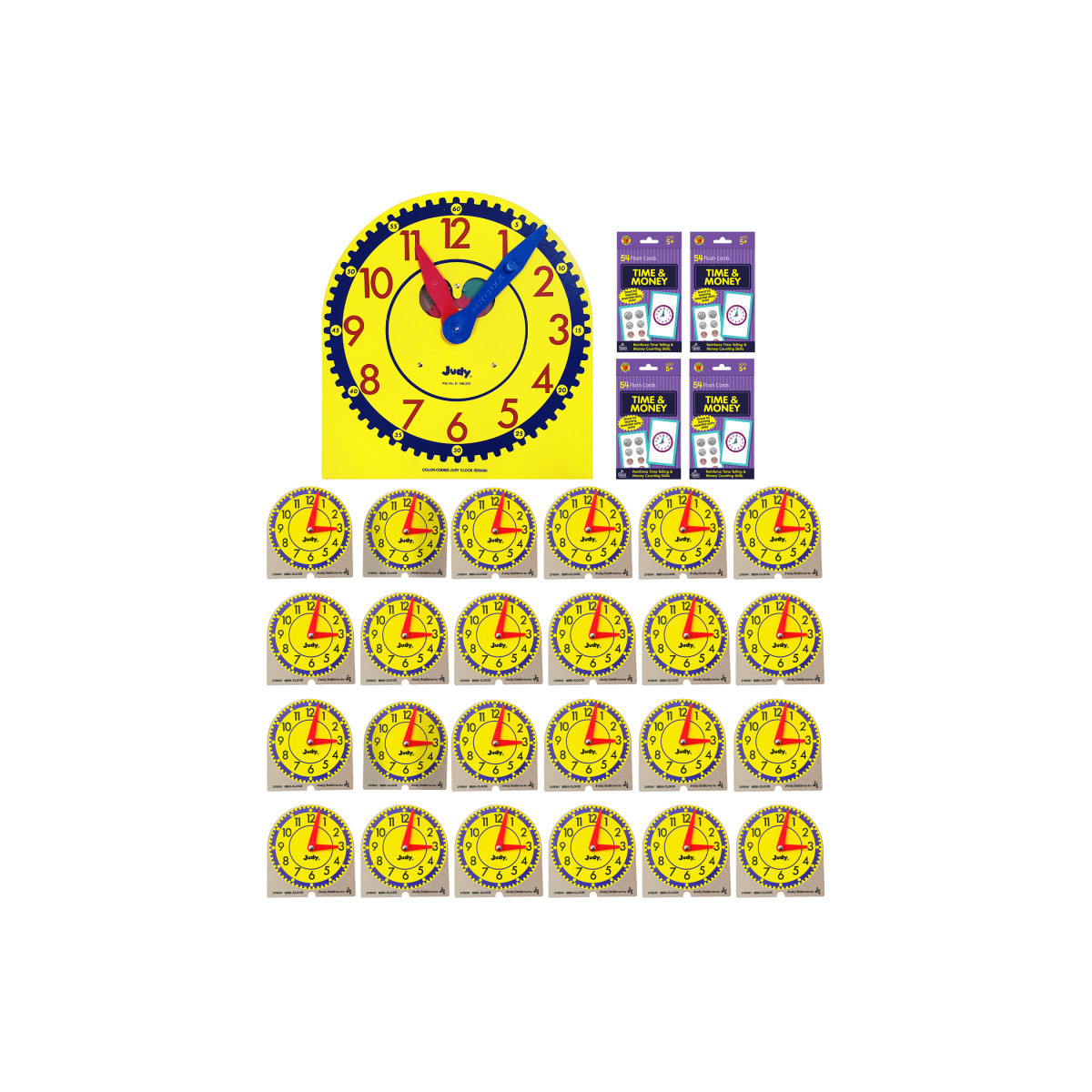 The set includes a Judy Clock, an activity guide, 24 mini clocks and 4 packs of time and money flash cards.