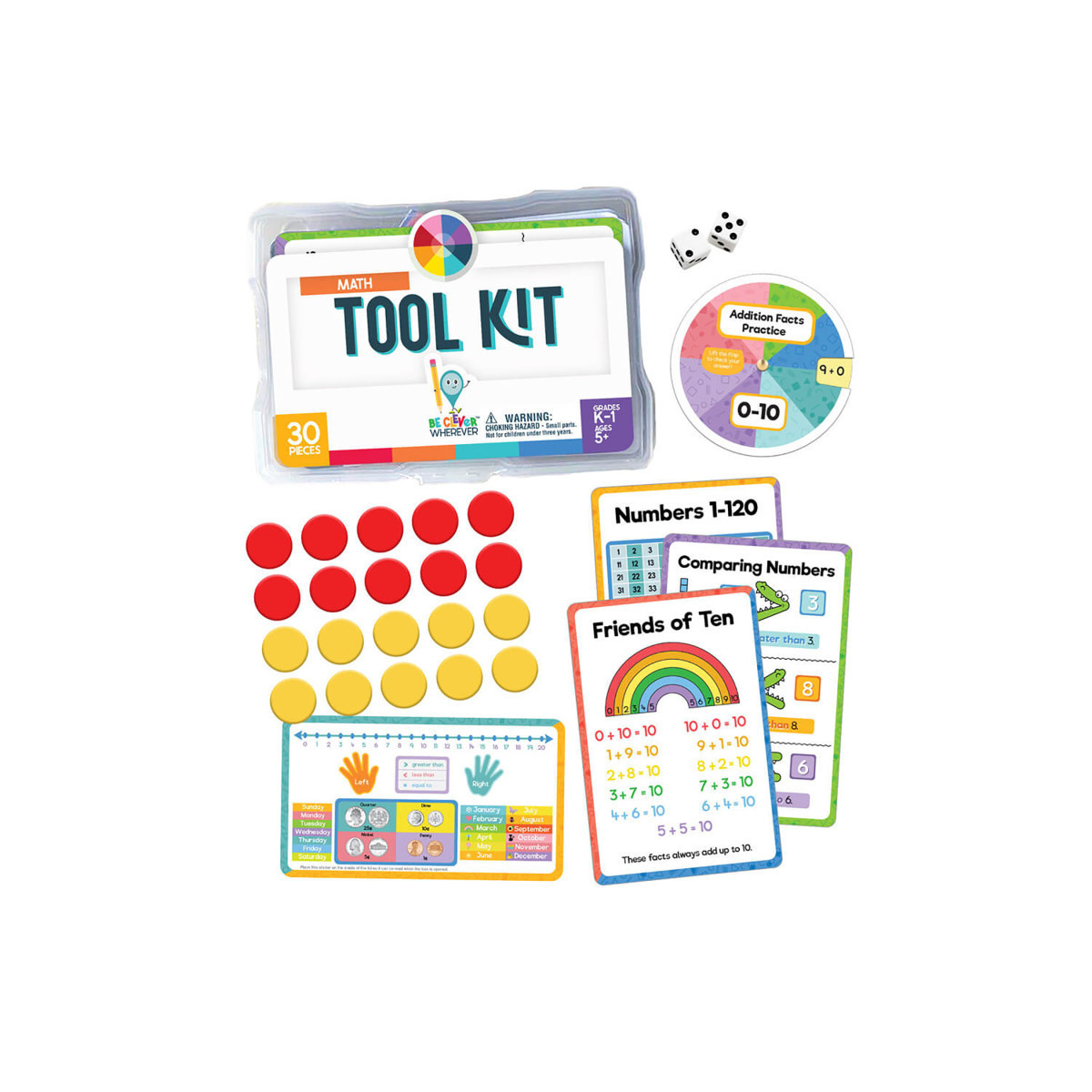 Make learning fun—anywhere, anytime—with Carson Dellosa's Be Clever Wherever Math Tool Kit. This portable K-1 math kit is packed with everything you need to support core math skills, including colorful reference charts, a fun facts practice wheel, and essential hands-on manipulatives such as dice and counters.