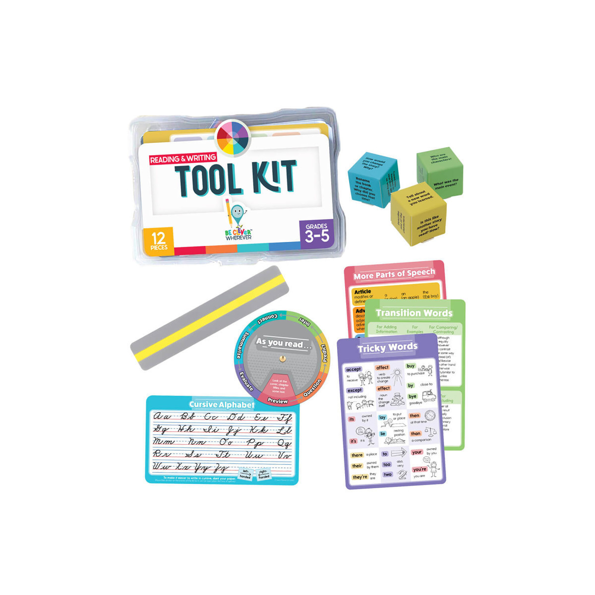 Make learning fun—anywhere, anytime—with Carson Dellosa's Be Clever Wherever Reading & Writing Tool Kit. his portable kit for 3rd—5th graders is packed with everything you need to support essential reading and writing skills, including colorful reference charts, a wheel to make and read words, and hands-on reading manipulatives such as a reading ruler and retelling dice.