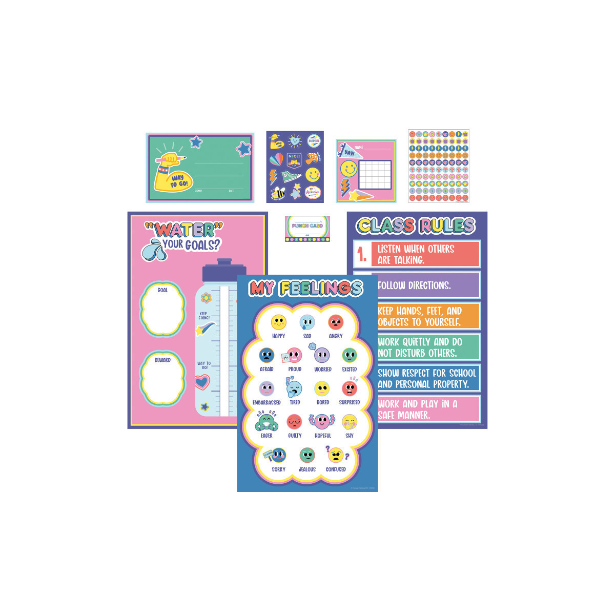 Classroom management is made easier with Carson Dellosa's We Stick Together Behavior Management Classroom Supplies! The 107-piece set includes everything you need to display class rules and goals, reinforce social emotional learning skills with a calming corner feelings chart, track student progress and behavior with incentive charts and punch cards, and reward students for a job well done with motivational stickers and award certificates.