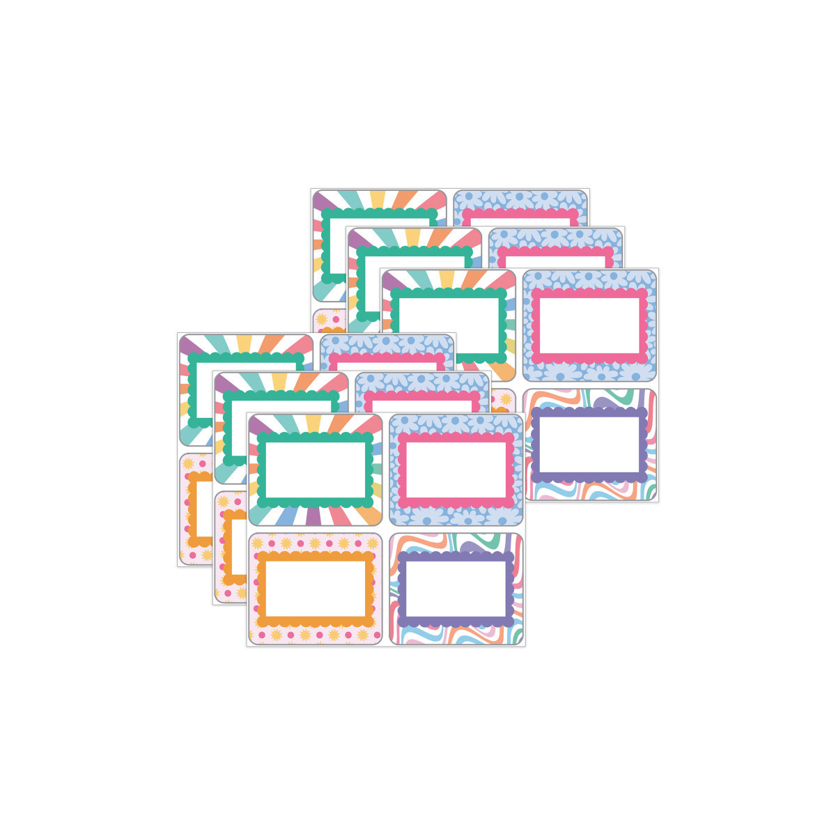 Add some retro vibes to your back to school teacher supplies and classroom décor with Retro Remix Name Tags! Each name tag set includes 40 self-adhesive name stickers that feature 4 colorful, groovy designs and 10 name tags per design. Each name tag measures 3" x 2.5"—the perfect size name tags for classroom cubbies, student name tags for desks, lockers, and tags for labeling school supplies and daycare essentials. Use the name tags as name labels for field trips, back to school introductions with students, or back to school nights and parent teacher conferences. Retro Remix, designed by Stephanie and Loreal of @HappilyEverElementary, partnered with Carson Dellosa to bring some fun, retro vibes to your learning environment. Sold as 6 packs for a total of 240 name tags.