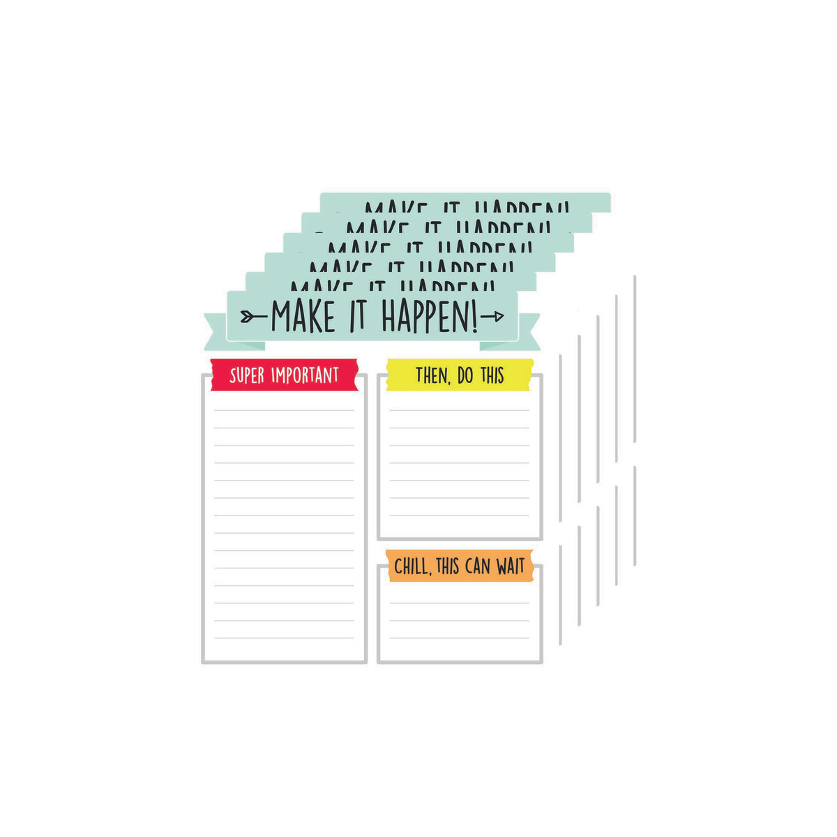 The 50-sheet Aim High notepad helps teachers stay organized and motivated. This stylish to-do list features three sections to help prioritize tasks and a "Make it Happen" banner across the top for inspiration. Teachers can never have enough notepads, and our stationery selection is second to none. With a variety of colors, themes, shapes, and designs, our acid-free and lignin-free notepads provide fun ways to write notes, play games, and create to-do lists. Make sure to view our other Aim High products to create a cohesive and contemporary classroom theme. Sold as a pack of 6 notepads.