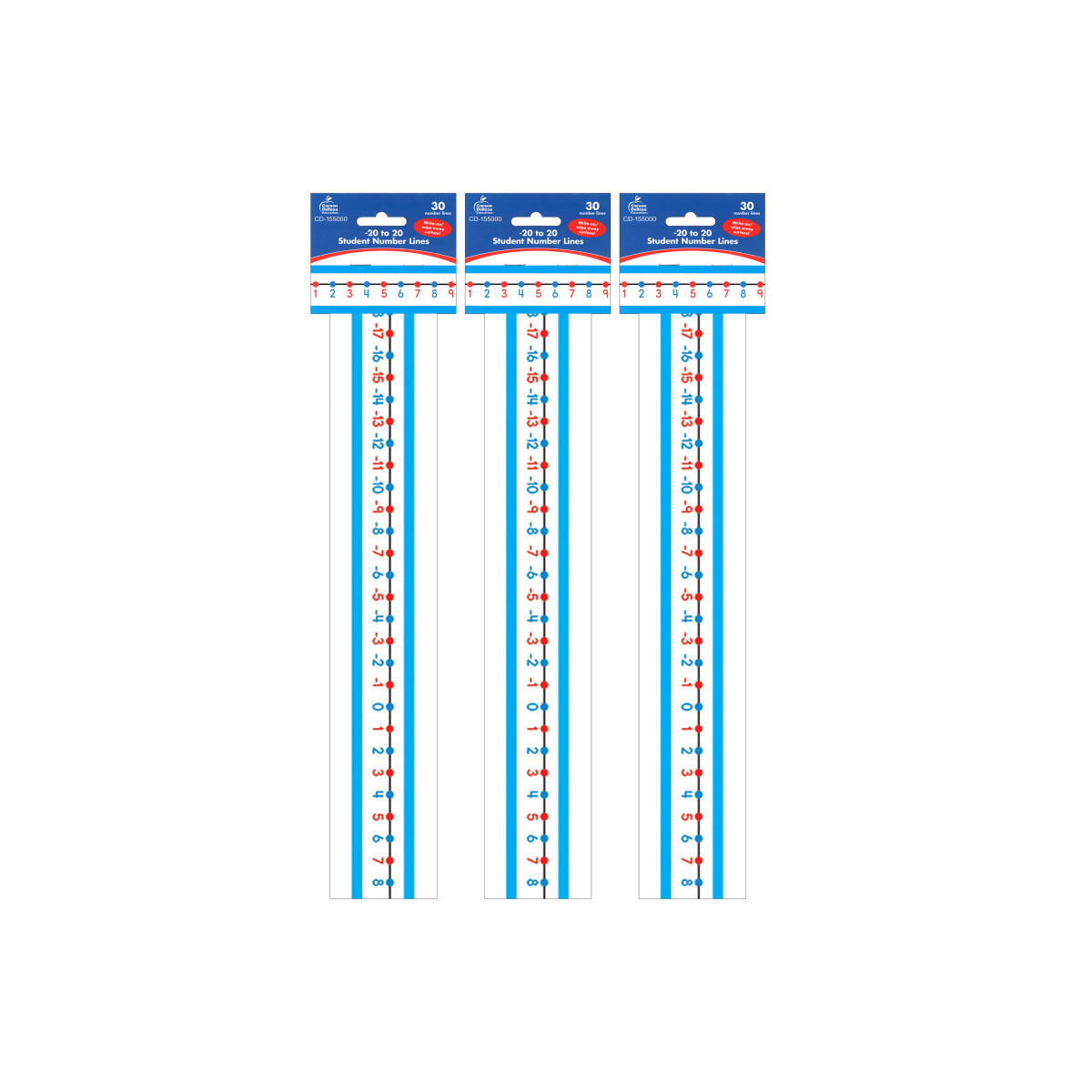 The -20 to 20 Student Number Lines are color coded to make it easy for students to recognize odd and even numbers. Each set of student number lines includes 30 number lines that measure 22" x 1.5" each. They also feature a write-on/wipe-away surface to make it easy for students to use over and over again! Student number lines are the perfect hands-on tool for reinforcing mathematical concepts such as counting, identifying number patterns, partitioning numbers, comparing numbers, and building number sense. Sold as 3 packs for a total of 90 number lines.