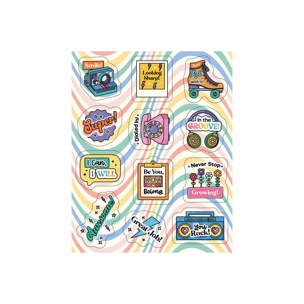From reward stickers to stickers for crafts, there are so many groovy ways to use Retro Remix Rainbow Motivational Stickers! The sticker pack includes 6 sheets of affirmation stickers (4.5" x 5.625") for a total of 72 inspirational stickers. Acid-free and lignin free, each sticker features a 70s and 80s stickers aesthetic, including roller skates, boombox, and polaroid camera design, with a positive affirmation. Use the stickers for kids classroom prizes or on schoolwork to motivate students.
