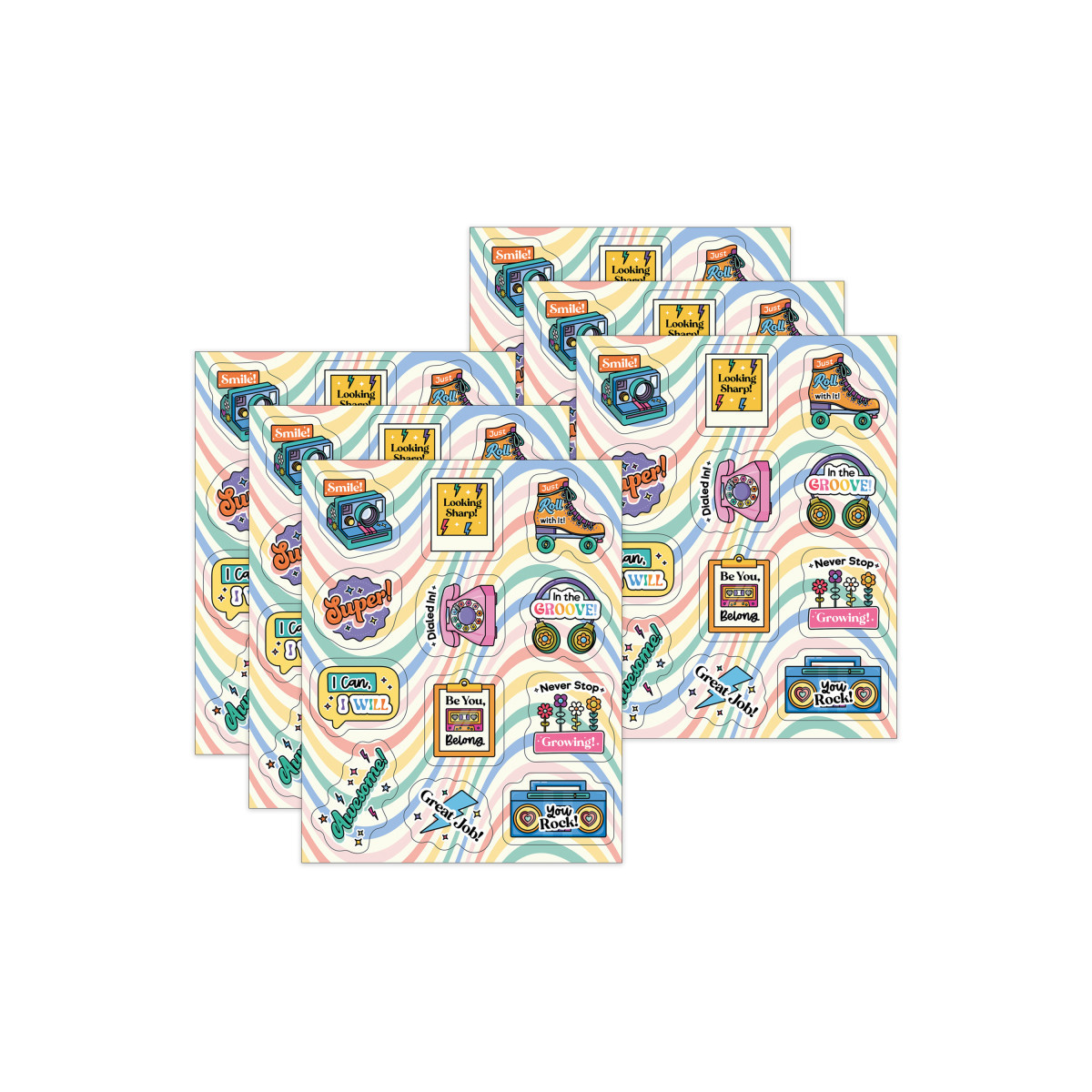 From reward stickers to stickers for crafts, there are so many groovy ways to use Retro Remix Rainbow Motivational Stickers! Each sticker pack includes 6 sheets of affirmation stickers (4.5" x 5.625") for a total of 72 inspirational stickers per pack. Acid-free and lignin free, each sticker features a 70s and 80s stickers aesthetic, including roller skates, boombox, and polaroid camera design, with a positive affirmation. Use the stickers for kids classroom prizes or on schoolwork to motivate students. You can also use the stickers for your classroom's reward chart or incentive chart! These rainbow stickers are great for crafts, 70s party decorations and 80s party decorations or party favors, sticker charts, reward systems for chores, potty training, and more! Retro Remix, designed by Stephanie and Loreal of @HappilyEverElementary, partnered with Carson Dellosa to bring some fun, retro vibes to your learning environment. Sold as 6 packs for a total of 432 stickers.
