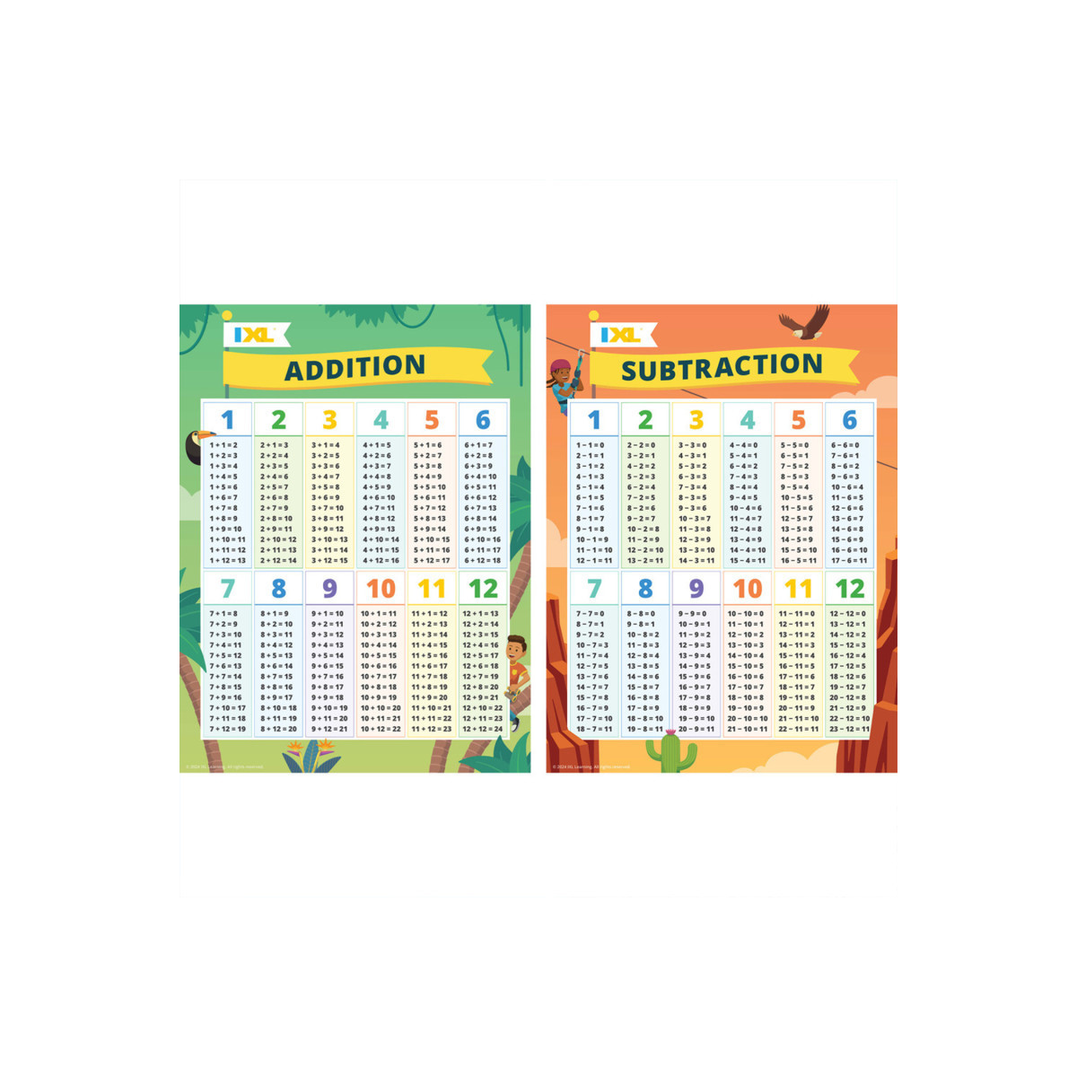 The IXL Addition & Subtraction Posters feature essential addition and subtraction facts for numbers 1-12. Perfect for displaying at home or in the classroom, these eye-catching posters reinforce addition and subtraction facts to help students build confidence and speed while practicing math.