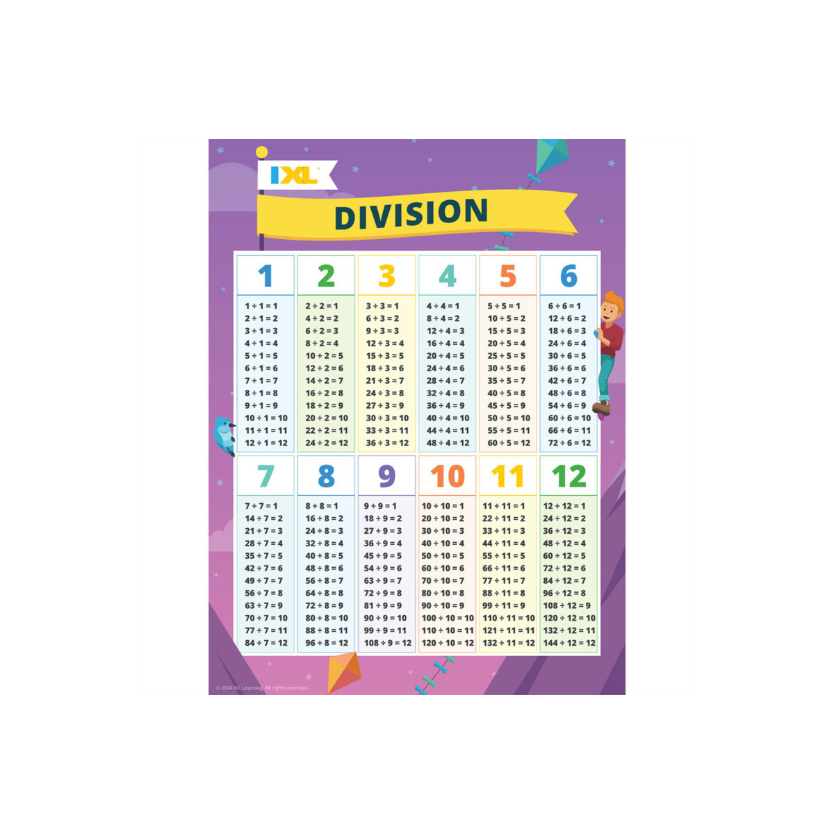 The IXL Division Poster features essential division facts for numbers 1-12. Perfect for displaying at home or in the classroom, this eye-catching poster reinforces division facts to help students build confidence and speed while practicing math.