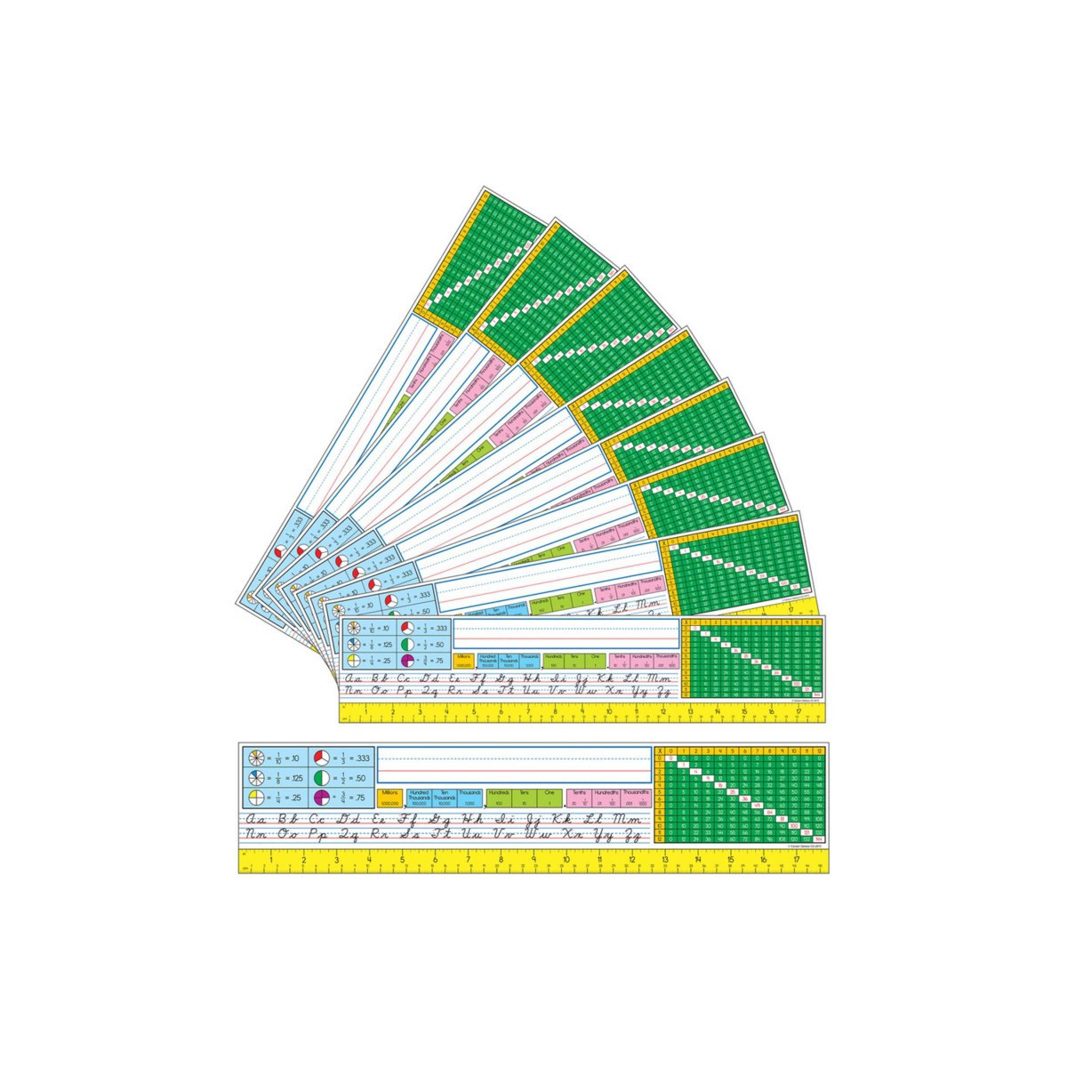 These Modern Cursive nameplates include a name line; modern cursive alphabet (uppercase and lowercase) with stroke lines; 0-12 multiplication table; place value chart with words, fractions, and numerals; fraction and decimal equivalents; and standard and metric rulers. Each nameplate is 18" x 4" and each pack includes 36 nameplates.