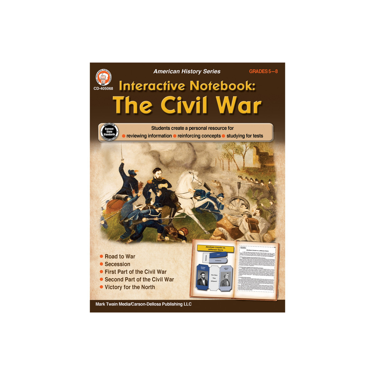 Mark Twain's Civil War Interactive Notebook helps 5th-8th graders create their own American history resource. Students strengthen their US history knowledge and creative and organizational skills through interactive learning. The 64-page American history book features multiple lessons and units of study focusing on the Civil War through interactive content. Students record, store, and organize essential information that is useful as a social studies reference guide for test prep. This standards-based notebook teaches US history through topics and lessons such as pre-war tensions, state secessions, important battles, and the North's path to victory. Students are encouraged to be creative, use color, and work with interactive content to gain a greater understanding of the topics covered, and become active participants in their own learning journey. Designed by leading educators, Mark Twain Media Publishing Company specializes in providing captivating, supplemental books and resources in a wide range of subjects for middle- and upper-grade classroom success.