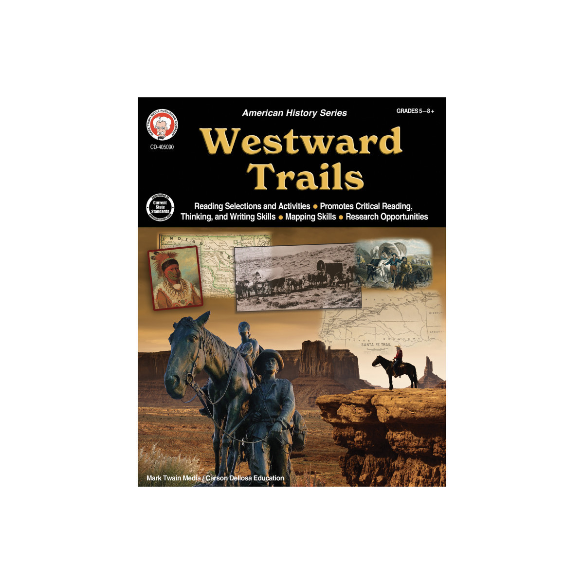 Go back in time to explore the western trails and learn about westward migration in the United States with the activity-packed Westward Trails US History Workbook by Mark Twain! American history books for students in grades 5-12 are a great way for students to learn about important social studies, history, and geography topics through engaging lessons and a variety of learning activities. Correlated to current state and national standards, this 8" x 10" US history workbook teaches students about the journeys of settlers and learn about the people and events involved in the settlement of the West through research, reflection, writing, and mapping activities.