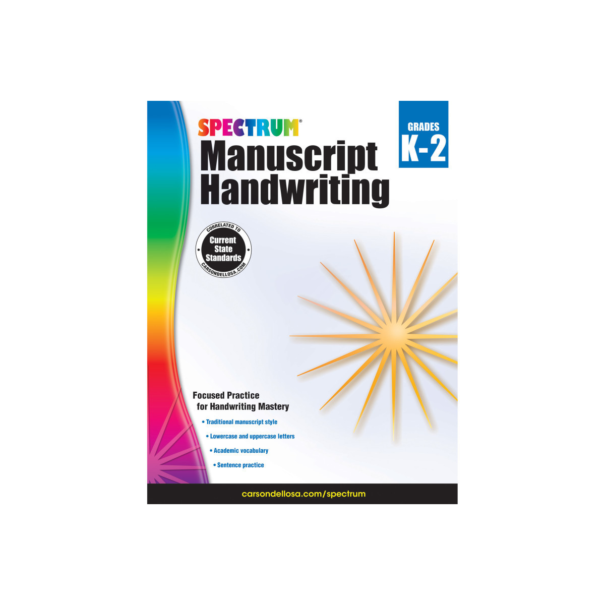 The Spectrum® Manuscript Handwriting Workbook for kindergarten through second grade features 96 pages of focused practice for traditional manuscript style handwriting. Legible writing gives students an advantage across disciplines as it helps the them take notes, complete homework, and communicate in a clear and timely manner.