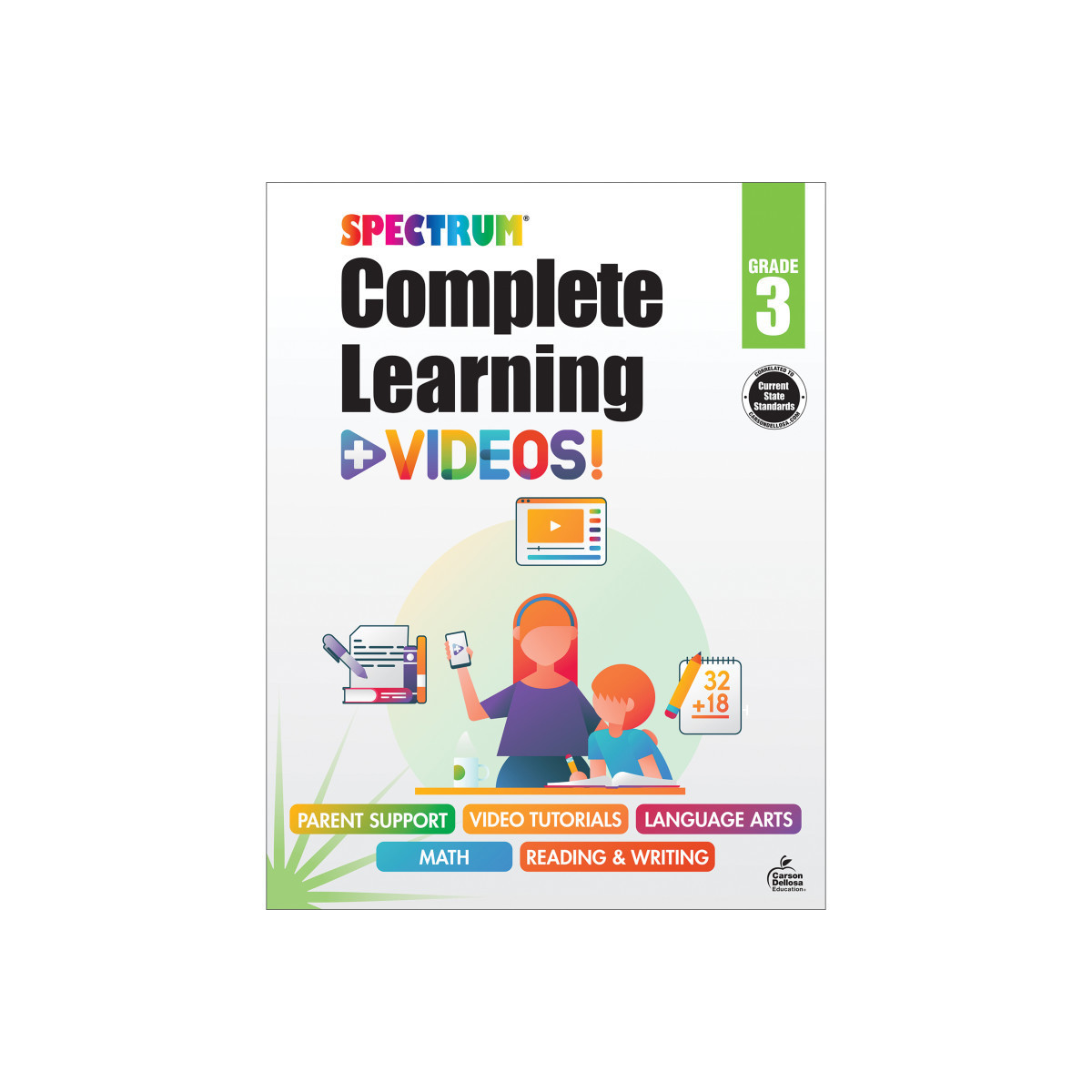 Spectrum's Complete Learning + Videos Grade 3 Workbook will help your child navigate through third grade and give you the tools you need to make sure your child learns everything they need to know for future math, reading, and language arts success. This innovative third grade workbook features lessons and activities that focus on math, reading, and language arts, as well as instructional videos to help strengthen skills needed for future academic success. Each chapter features chapter introductions that focus on the what, why, and how of each lesson, with standards-based drills and skill practice. A QR code is available to scan after each lesson, linking to a free video that reinforces each topic—a great tool for visual learners.
