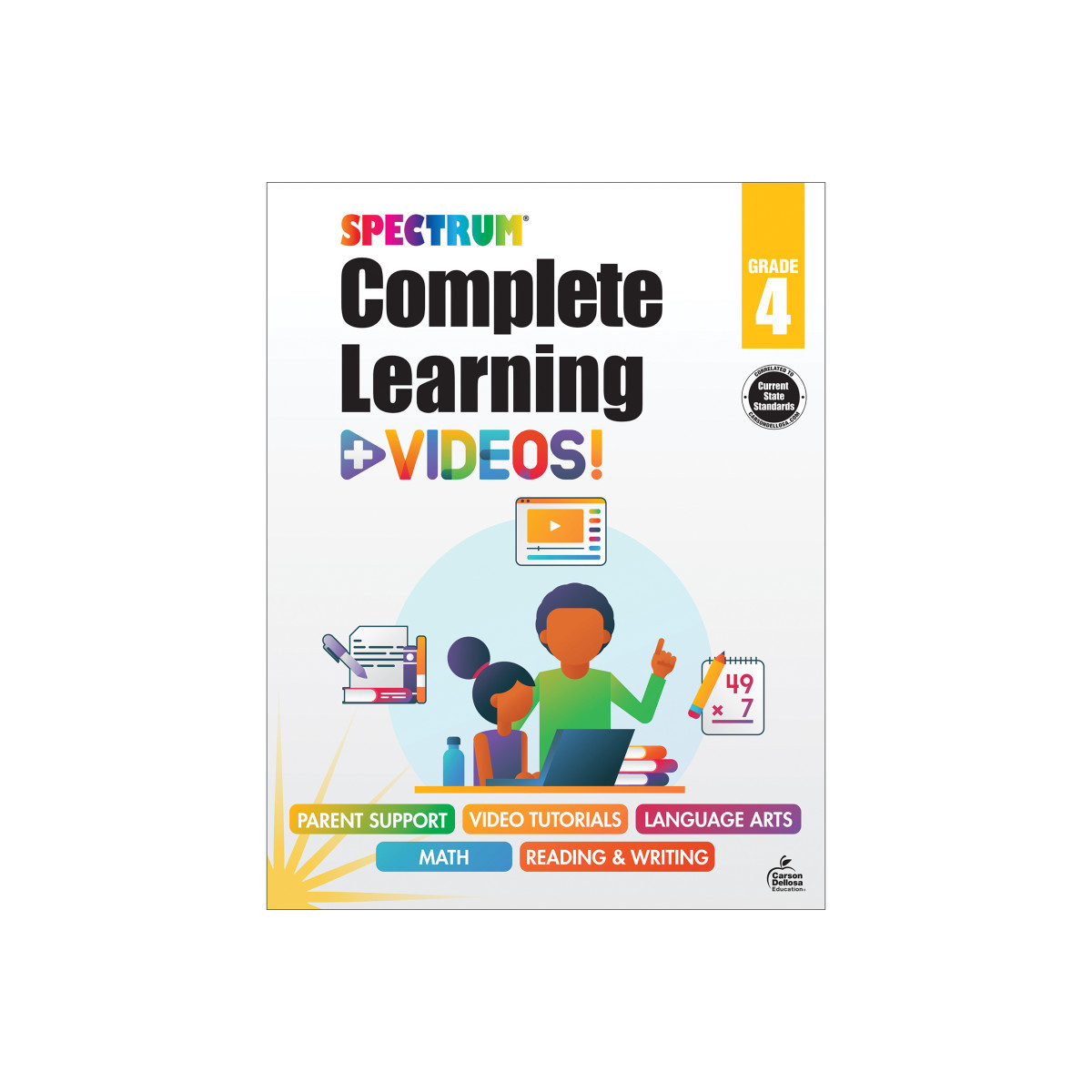 Spectrum's Complete Learning + Videos Grade 4 Workbook will help your child navigate through fourth grade and give you the tools you need to make sure your child learns everything they need to know for future math, reading, and language arts success. This innovative fourth grade workbook features lessons and activities that focus on math, reading, and language arts, as well as instructional videos to help strengthen skills needed for future academic success. Each chapter features chapter introductions that focus on the what, why, and how of each lesson, with standards-based drills and skill practice. A QR code is available to scan after each lesson, linking to a free video that reinforces each topic—a great tool for visual learners.