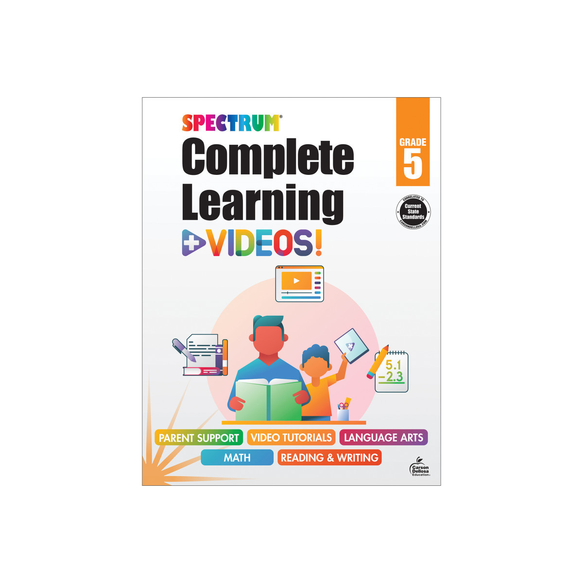 Spectrum's Complete Learning + Videos Grade 5 Workbook will help your child navigate through fifth grade and give you the tools you need to make sure your child learns everything they need to know for future math, reading, and language arts success. This innovative fifth grade workbook features lessons and activities that focus on math, reading, and language arts, as well as instructional videos to help strengthen skills needed for future academic success. Each chapter features chapter introductions that focus on the what, why, and how of each lesson, with standards-based drills and skill practice. A QR code is available to scan after each lesson, linking to a free video that reinforces each topic—a great tool for visual learners. Parents love using this workbook for added practice from home, and teachers love to incorporate the reading, ELA, and math book into hands-on lesson plans and activities—tracking student progress with the answer key in the back of the 5th grade workbook. For more than 20 years, Spectrum has provided solutions for parents and teachers who want to help their children get ahead and exceed learning goals. Spectrum supports your child's educational journey every step of the way.