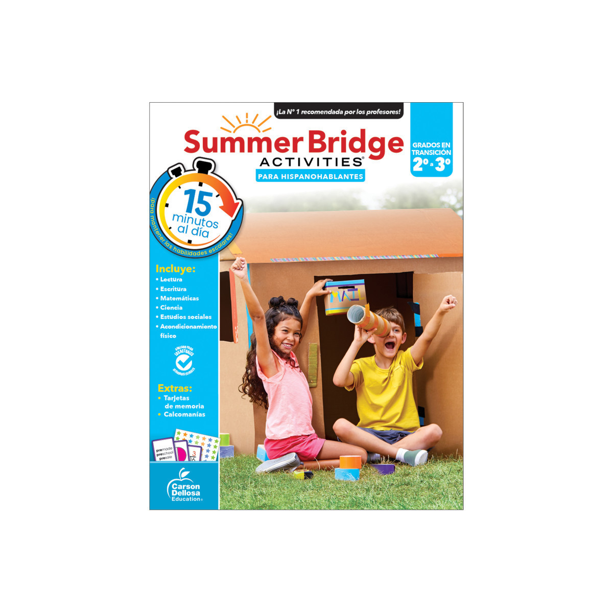 Prevent summer learning loss and prepare your child for back-to-school success in just 15 minutes a day with engaging activities, exercises, fun games, and more – all in one workbook with Summer Bridge Activities Spanish Workbook! This Spanish book helps Spanish-speaking second - third graders keep their skills sharp while learning English during the summer months to stop summer slide through fun practice pages and activities, covering math, science, reading, writing, social studies, fitness, and more. Students practice parts of speech, number patterns, counting money, hands-on science experiments, and other engaging topics, with both activities and directions in Spanish. This Spanish workbook for kids includes flash cards, stickers, and a completion certificate, and features a skill matrix and answer key to track student progress. Each page is numbered by day so kids and parents can track progress and reach monthly learning goals.