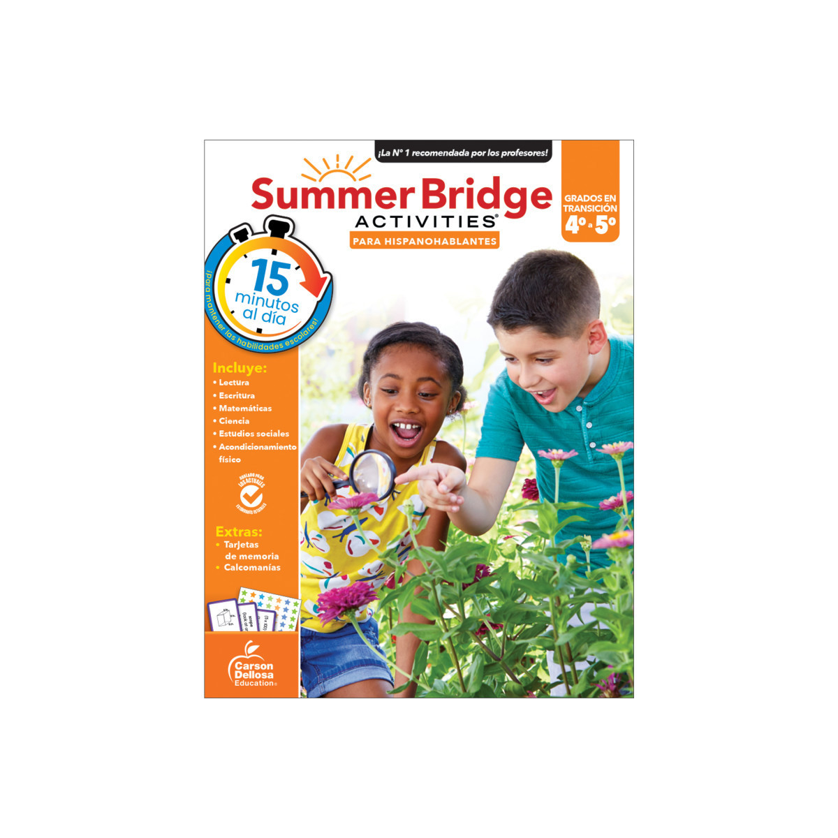 Prevent summer learning loss and prepare your child for back-to-school success in just 15 minutes a day with engaging activities, exercises, fun games, and more – all in one workbook with Summer Bridge Activities Spanish Workbook! This Spanish book helps Spanish-speaking fourth - fifth graders keep their skills sharp while learning English during the summer months to stop summer slide through fun practice pages and activities, covering math, science, reading, writing, social studies, fitness, and more. Students practice reading passages, grammar, multiplying, dividing, hands-on science experiments, and other engaging topics, with both activities and directions in Spanish.