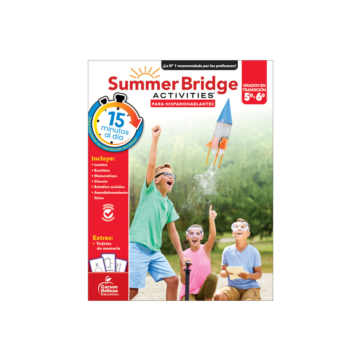 Prevent summer learning loss and prepare your child for back-to-school success in just 15 minutes a day with engaging activities, exercises, fun games, and more – all in one workbook with Summer Bridge Activities Spanish Workbook! This Spanish book helps Spanish-speaking fifth - sixth graders keep their skills sharp while learning English during the summer months to stop summer slide through fun practice pages and activities, covering math, science, reading, writing, social studies, fitness, and more. Students practice grammar, writing skills, fractions, solving equations, geography, science experiments, and other engaging topics, with both activities and directions in Spanish. This Spanish workbook for kids includes flash cards and a completion certificate, and features a skill matrix and answer key to track student progress. Each page is numbered by day so kids and parents can track progress and reach monthly learning goals.
