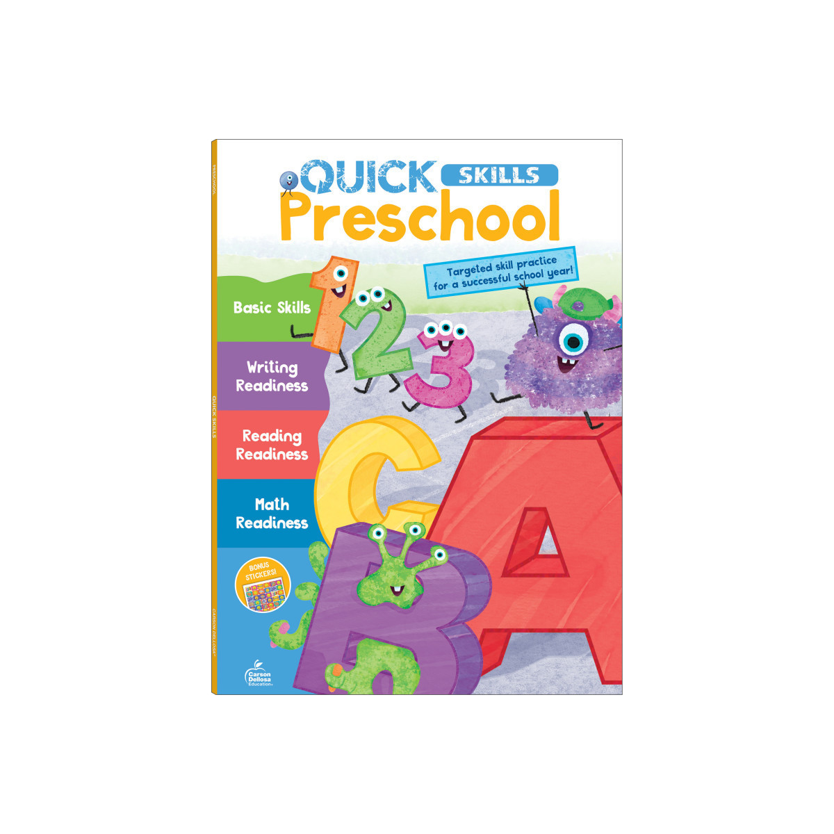 Support your child's education with Carson Dellosa's Quick Skills Preschool Workbook that teaches basic preschool math, phonics, and writing skills to preschoolers. Preschool Workbooks for kids ages 4+ are a great way for preschoolers to learn basic skills such as letter and number recognition, identifying colors & shapes, and more through a variety of toddler learning activities that are both fun AND educational! Tracing numbers and letters, identifying colors & shapes, counting, and alphabet skills are a few of the fun preschool learning activities that incorporate early learning concepts into everyday settings to help inspire learning into your child's classroom curriculum or homeschool curriculum. The 80-page preschool book is sized at about 7.75" x 10.