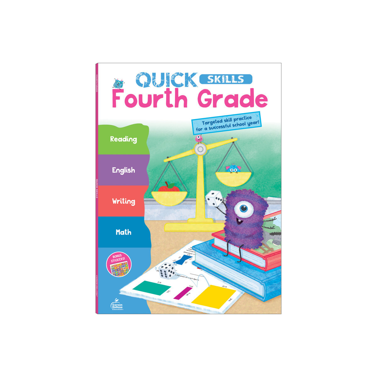 Support your child's education with Carson Dellosa's Quick Skills 4th Grade Workbooks All Subjects that help prepare your 4th grade student for 4th grade math, language arts, reading comprehension, and writing success. All Subject 4th grade books are a great way for children to practice essential skills such as geometry, parts of a sentence, handwriting practice, and more through focused practice. Identifying main idea & details in a story or passage, rounding numbers, and estimating are a few of the topics that are included in the ELA & math workbook to help inspire learning in your child's homeschool curriculum or classroom curriculum. The 80-page workbook is sized at about 7.75" x 10.6"—giving your child plenty of space to complete each exercise. The workbook includes an answer key to track student progress as well as a sheet of stickers to reward your 4th grade student on a job well done after completing activities.
