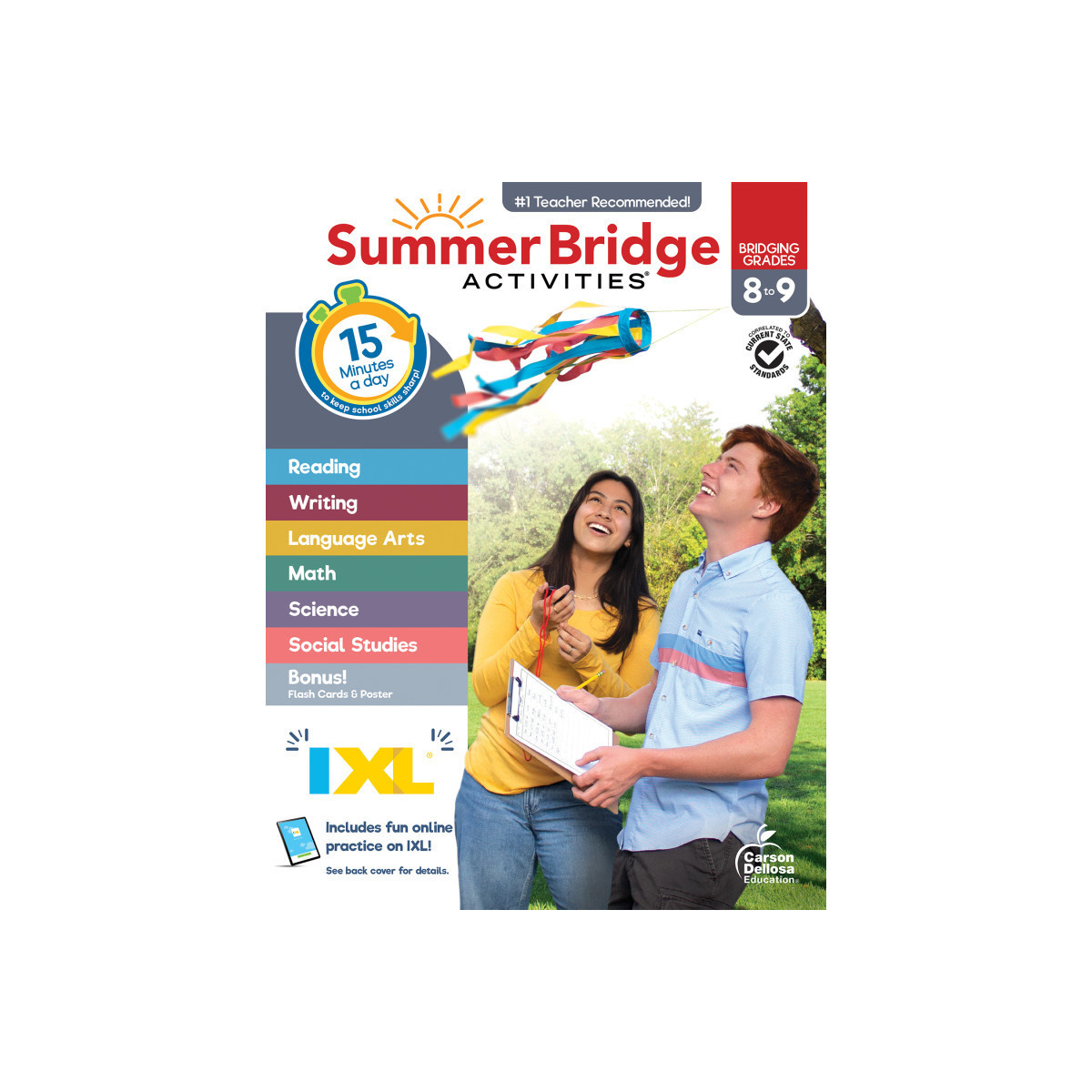 Build a bridge of learning opportunities for your soon-to-be 9th grader—from school to home and back again in just 15 minutes a day with Summer Bridge Activities® 8th grade to 9th grade workbooks all subjects! This 160-page summer learning workbook will help your child learn essential math, language arts, science, social studies, and fitness skills during summer break through quick 15-minute, active learning adventures.