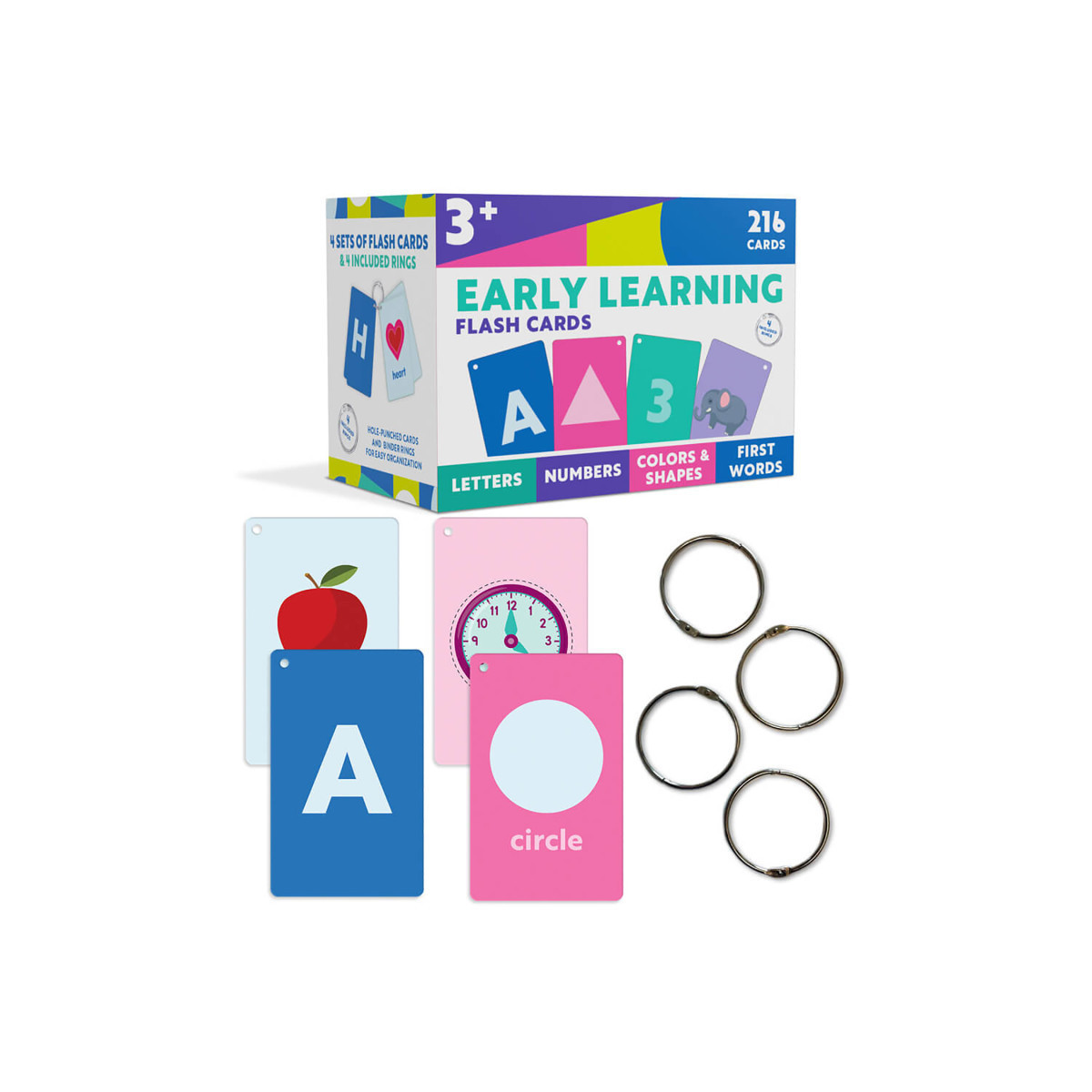 Turn preschool and kindergarten lessons into fun, phonics games and math games that bring learning to life with Carson Dellosa's Early Learning Toddler Flash Cards! The kids flash cards set includes 4 packs of pre-punched flash cards: alphabet, colors & shapes, sight words, and numbers 0-25 math flash cards with 7 bonus resource cards (216 total cards; 209 flash cards). 4 dividers and 4 binder rings are also included to organize your cards with ease. Help your toddler learn alphabet letters, basic sight words, colors and shapes, and how to count up to 25! Use the included bonus resource cards for even more phonics and math games. Attach the toddler flash cards to the binder rings to practice early learning skills from just about anywhere for on-the-go learning fun.