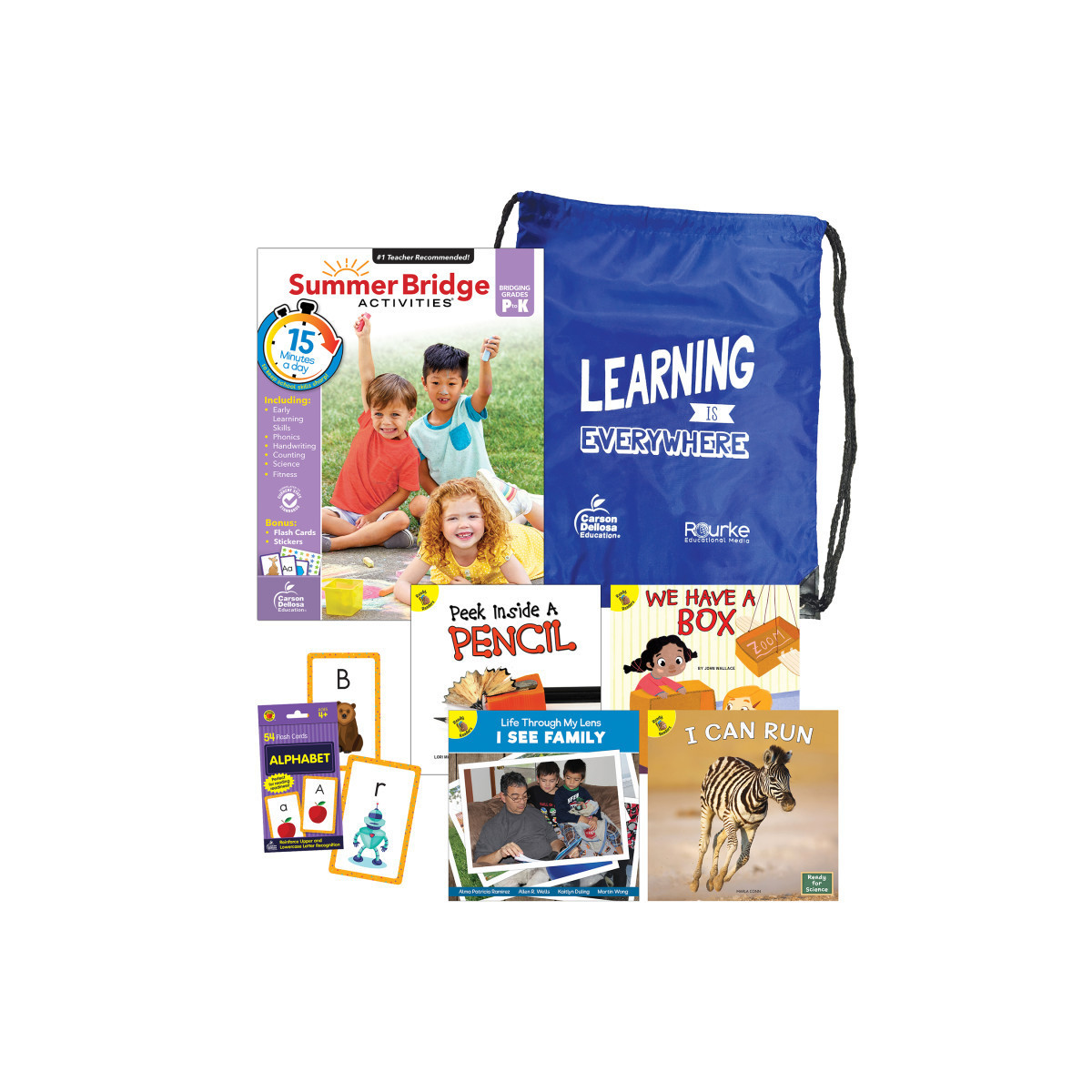 Help prevent summer learning loss and prepare your preschooler for back-to-school success in just 15 minutes a day with engaging summer learning activities, children's books, and fun games—all in one bundle! Featuring a Summer Bridge Activities PreK to Kindergarten workbook, phonics flash cards, and kid's books, this backpack is great for practice and enrichment to keep your child learning all summer long and better prepare for the school year ahead. Summer Bridge Activities kindergarten workbooks feature phonics, early learning, math, science, and handwriting activities, and includes flash cards, stickers, and fun fitness activities, too! Toddlers can practice their reading comprehension skills with the included children's books, as well as alphabet learning with the alphabet flash cards. Each kindergarten learning resource is stored securely in the durable drawstring bag so your child can practice skills on-the-go. Practice during long road trips, downtime during the summer, and more.