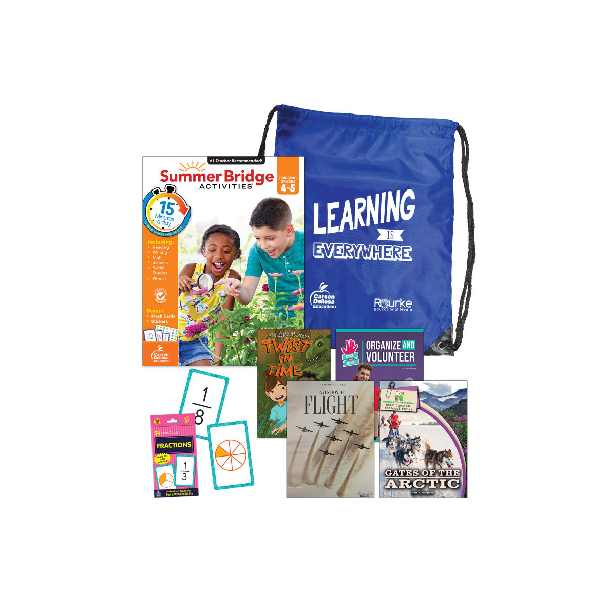 Help prevent summer learning loss and prepare your fourth grader for back-to-school success in just 15 minutes a day with engaging summer learning activities, children's books, and fun games—all in one bundle! Featuring a Summer Bridge Activities 4th grade to 5th grade workbook, math flash cards, and kid's books, this backpack is great for practice and enrichment to keep your child learning all summer long and better prepare for the school year ahead.