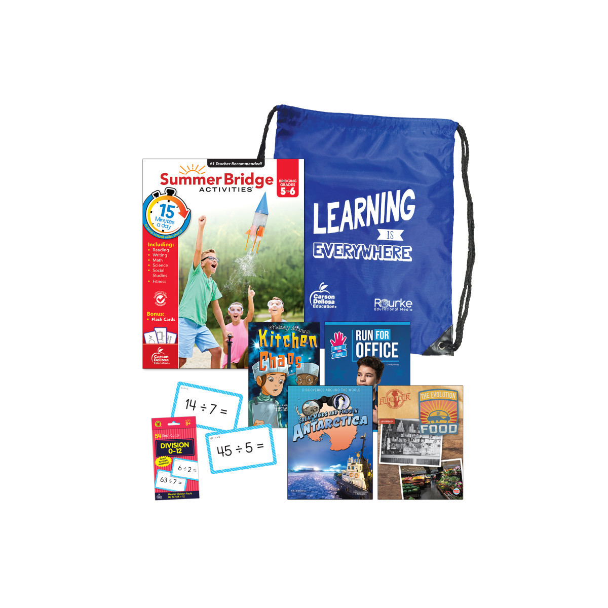 Help prevent summer learning loss and prepare your fifth grader for back-to-school success in just 15 minutes a day with engaging summer learning activities, children's books, and fun games—all in one bundle! Featuring a Summer Bridge Activities 5th grade to 6th grade workbook, math flash cards, and kid's books, this backpack is great for practice and enrichment to keep your child learning all summer long and better prepare for the school year ahead. Summer Bridge Activities 6th grade workbooks all subjects feature math, science, reading comprehension, social studies, and handwriting activities, and includes flash cards and fun fitness activities, too! Kids can also practice their reading comprehension skills with the included children's books, as well as additional math skills with the division flash cards. Each resource is stored securely in the durable drawstring bag so your child can practice skills on-the-go. Practice during long road trips, downtime during the summer, and more.