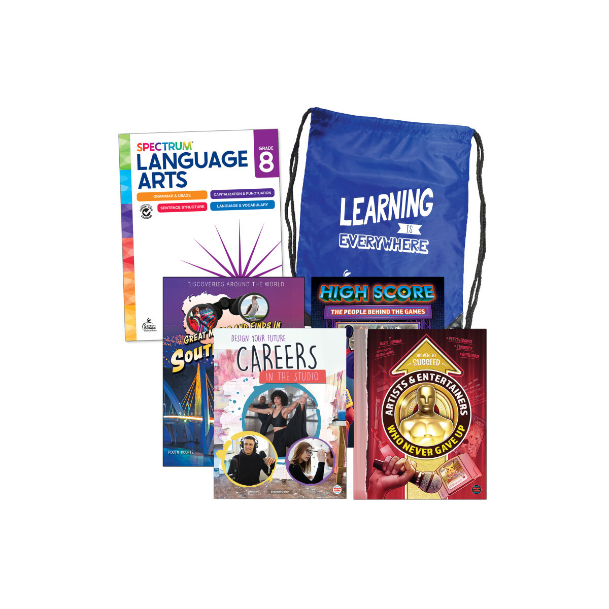This bundle includes a 8th grade language arts workbook as well as fiction and nonfiction books.